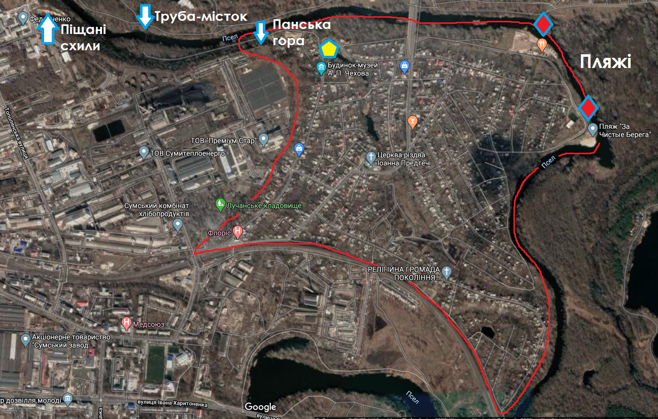 Для того, аби зорієнтуватися — тримайте скріншот з мапи, на якому вказані позначки місць та обведено межі селища Лука, яке зараз є частиною міста Суми.