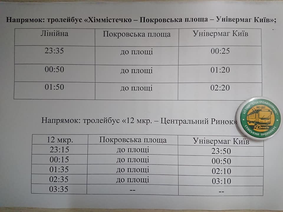 Комунальне підриємство "Електроавтотранс" опублікувало графік роботи тролейбусів та автобусів у Сумах у ніч з 31 грудня на 1 січня. Працюватимуть 4 напрямки (3 тролейбусні та 1 автобусний): «Хіммістечко - Покровська площа - Універмаг Київ»; «12 мікрорайон - Центральний ринок»; «Центральний ринок - Пансіонат для ветеранів (вул. Ковпака)»; «Баси - Покровська площа - Універмаг Київ. Підписуйся […]