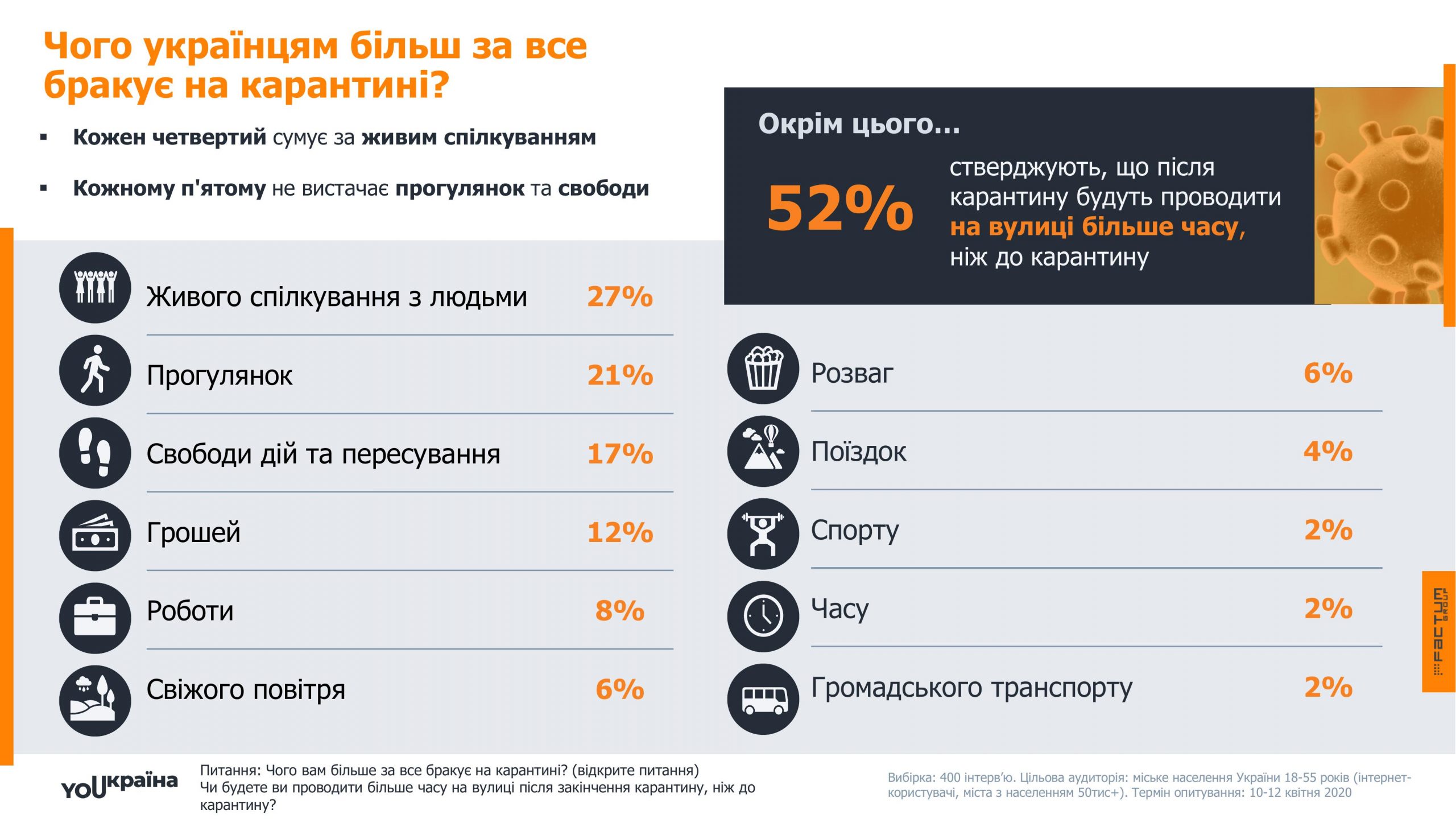Серед опитаних виявилось, що 4% скучили за поїздками, а 6% потребують розваг та свіжого повітря. 8% сумують за роботою, в той самий час як 12% не вистачає коштів. 17% прагнуть свободи дій та пересування, 21% хоче прогулянок, а 27% не вистачає живого спілкування. Найменше люди потребують громадського транспорту, часу та занять спортом.