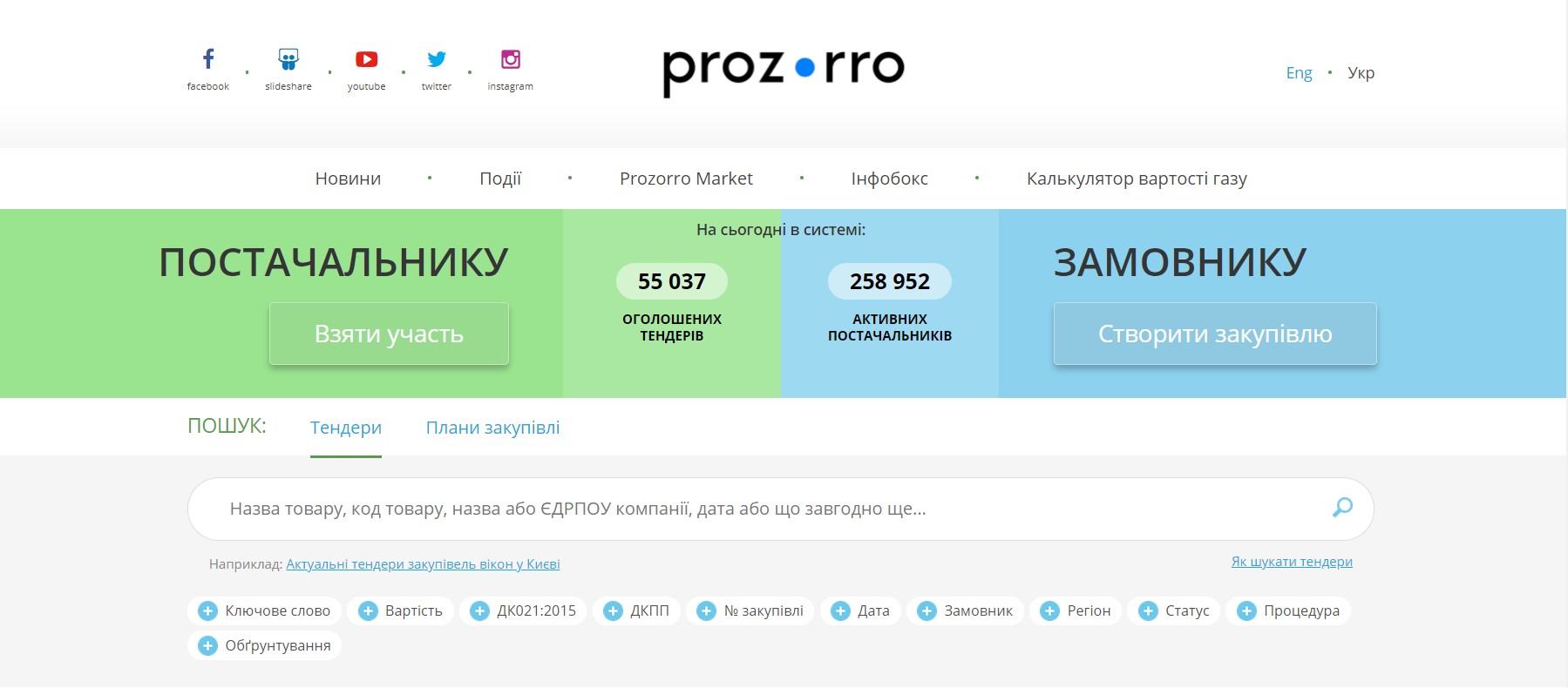 На головній сторінці сайту Prozorro вкажіть регіон, що вас цікавить, назву послуги чи товару, вартість робіт або номер конкретної закупівлі – всі торги, що відбулися раніше або тривають досі, будуть відображені у цьому списку.