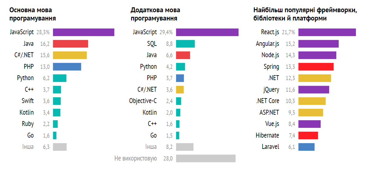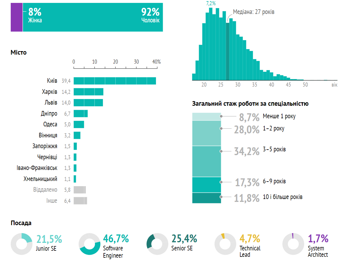• Найпоширеніша посада — Software Engineer (46,7%), Junior-ів та Senior-ів удвічі менше та приблизно порівну: 21,5% та 25,4% відповідно.