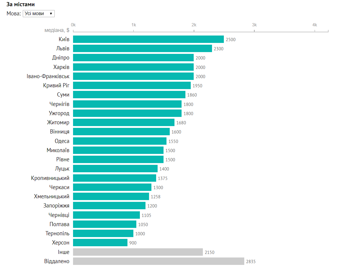 Може здатися, що Суми — це зростаючий ІТ-центр з високими зарплатами, але ні. По цих трьох містах є лише 12, 15 та 17 анкет відповідно. Тому ці цифри можна вважати нерепрезентативними загалом.