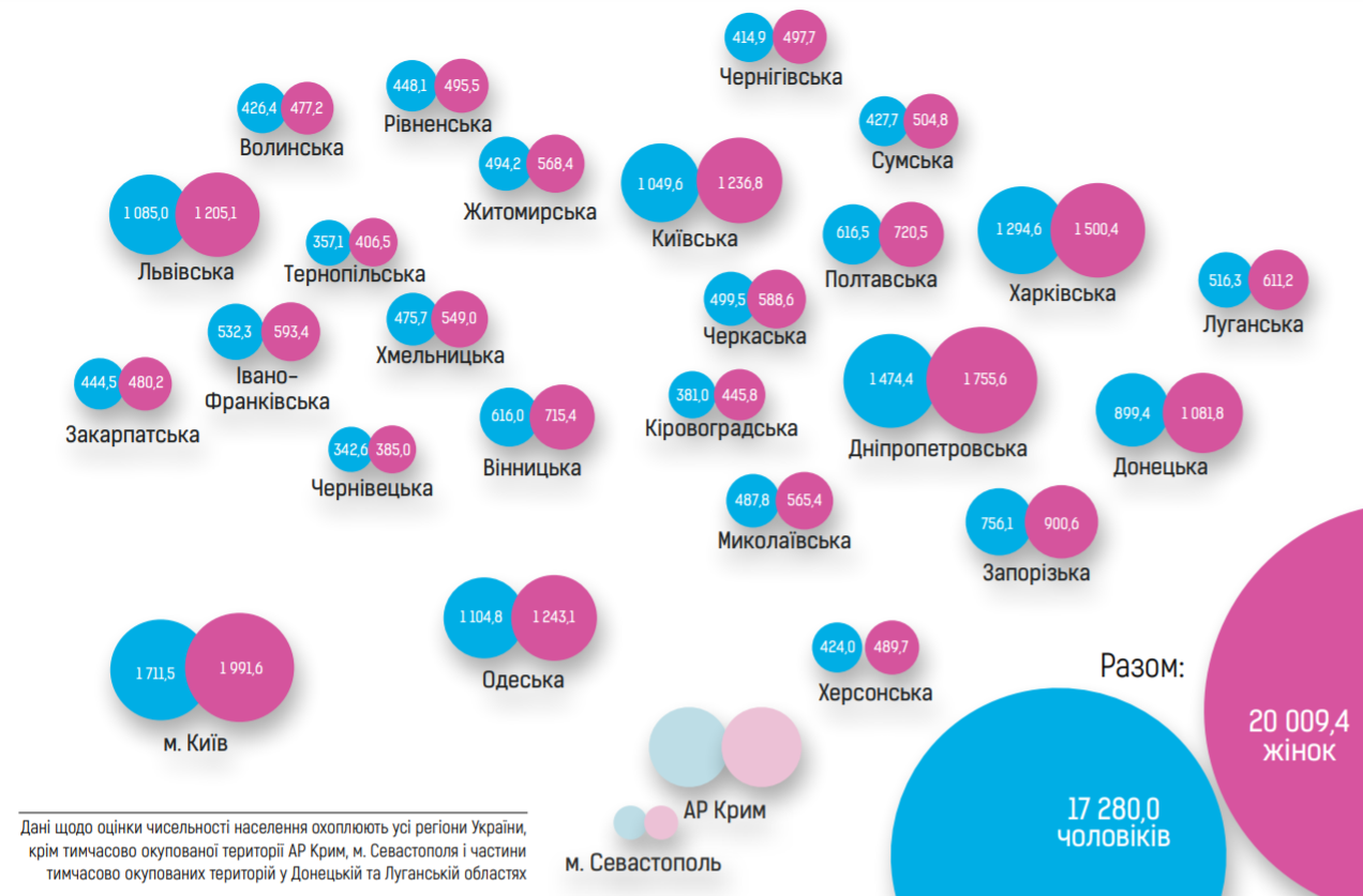 У Сумській області проживає 932,5 тисяч людей: чоловіки — 427,7 тисяч, жінки — 504,8 тисячі.