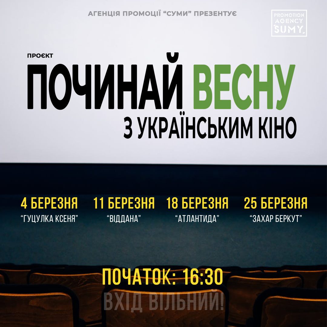 Сумчанам пропонують переглянути відомі українські фільми. Кінопокази відбудуться в рамках проєкту «Починай весну з українським кіно» від Агенції промоції «Суми». Транслюватимуть фільми щочетверга, впродовж усієї весни. Кінопокази стартують з 4 березня. Які будуть фільми Коли: щочетверга у березні, о 16:30 Де: вулиця Соборна, 27 Вартість: вхід безплатний Попередній запис: 0542-679-839 Фото: Агенція промоції «Суми», facebook.com Детальніше Згідно […]