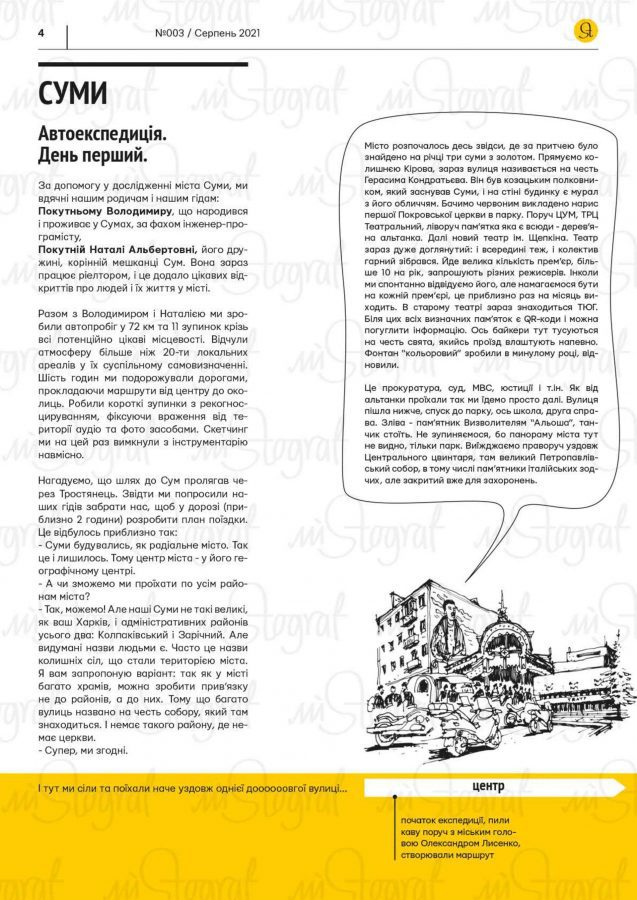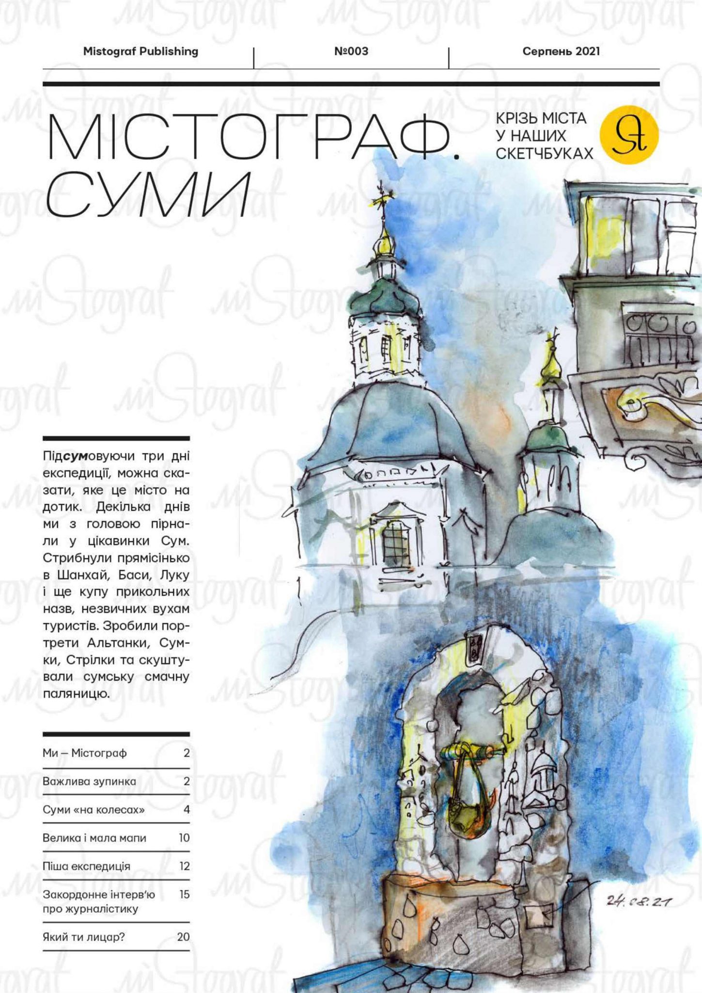 Третій випуск газети автори присвятили експедиції до Сум та області. Подорож почали із Тростянця, тож у виданні поділилися враженнями від Круглого двору та фестивалю історичної реконструкції «Стара фортеця», який проводився у місті до війни. Наступні 11 сторінок родина розповідає про автомобільну та пішохідну експедиції Сумами, публікує мапи з маршрутами та скетчі. На них побачите центр міста, «Романтику», університети, наукову бібліотеку та сходи на Соборну.