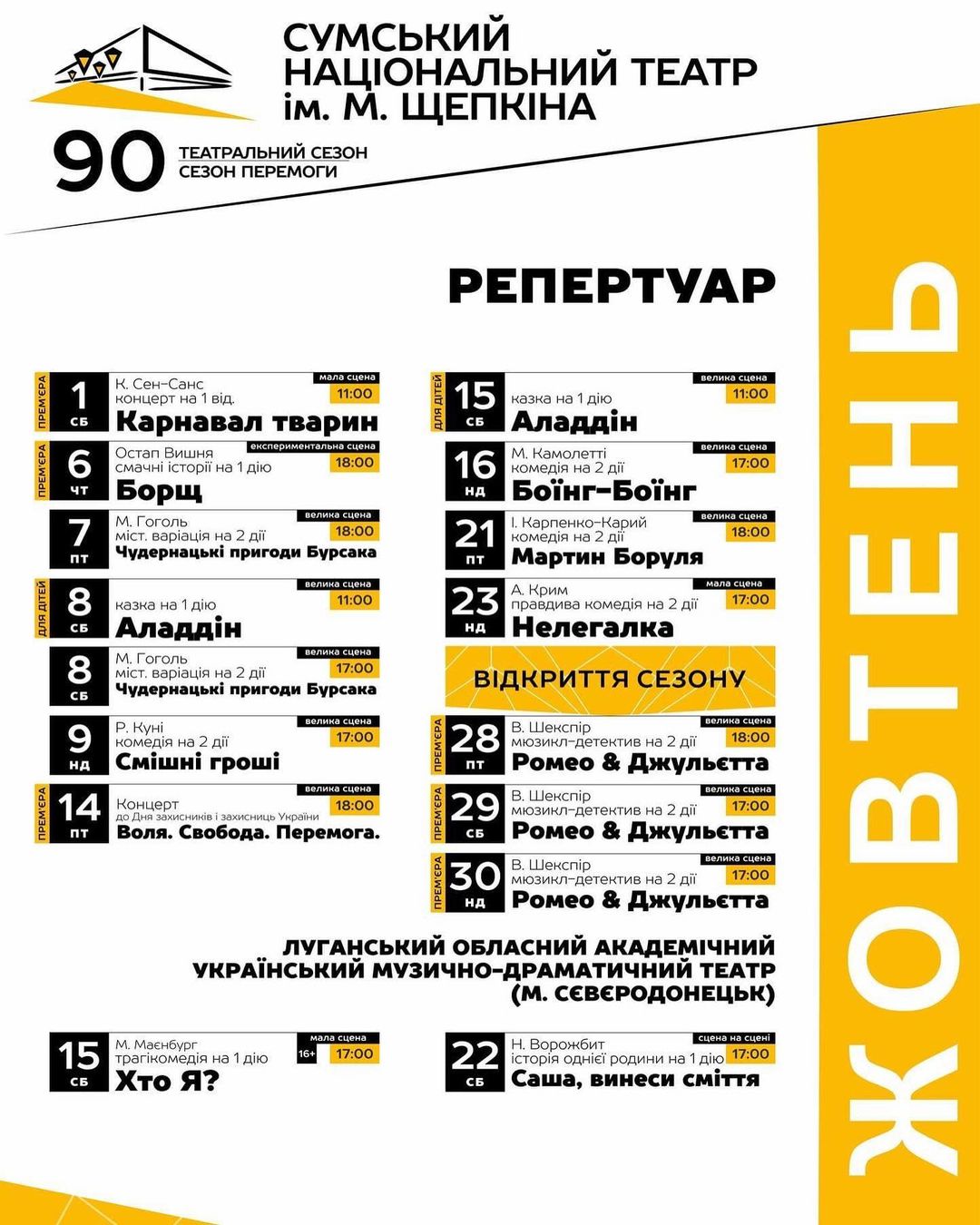 У Сумському національному театрі імені Михайла Щепкіна готуються до початку 90-го «сезону перемоги». Перед його відкриттям пройдуть ще 12 показів від луганської та сумської команд із виставами на різні теми. Аби придбати квитки, не потрібно бігти до каси — зробити це можна онлайн на сайті театру. Які вистави відвідати Окрім виступів місцевого колективу, в жовтні […]