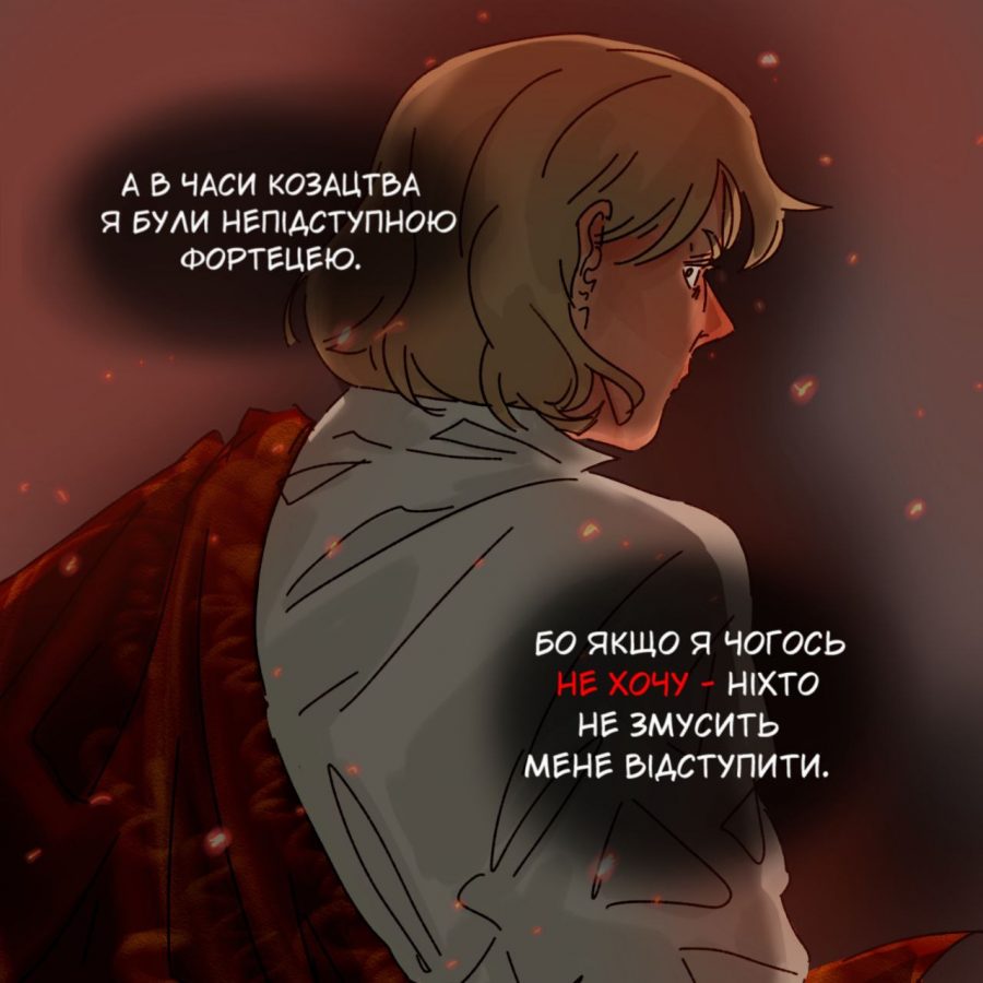 «Зображені на малюнках події ― це те, що мене найбільше зачепило в плані відображення характеру міста. Я дивлюся на те, як певні події в історії формують їх особистості або відображають певні риси. Зібравши в голові події, що найбільше мене вразили, створила такий образ ― впевнені, самостійні та стійкі. Такими я побачила Суми», ― розповідає авторка.