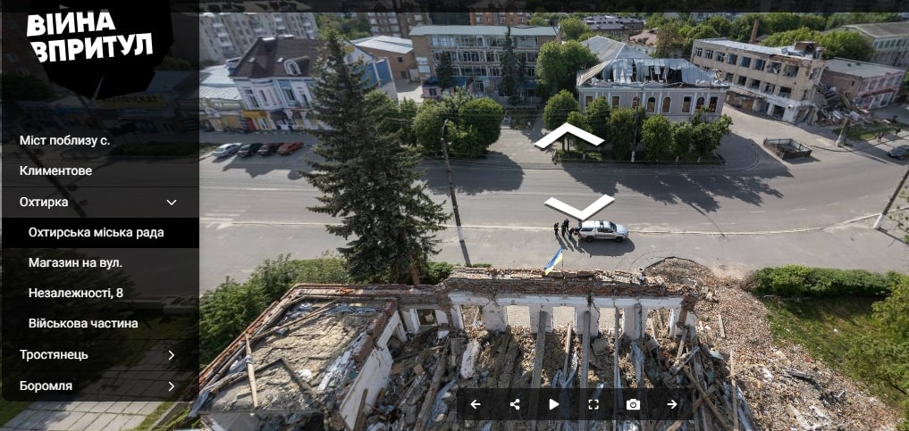 Платформа United24 та агенція «And Us» презентували сайт, на якому можна у форматі онлайн-прогулянки оглянути вулиці українських міст, що були окуповані або зазнали значних руйнувань. Серед них ― Тростянець та Охтирка на Сумщині. Проєкт створений за підтримки команди «War up close», яка має власний сайт з віртуальними турами містами та селами України.