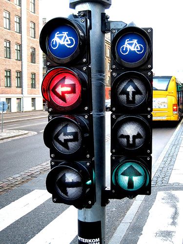 Міські перехрестя обладнані велосипедними переїздами, які виділені синім кольором. Разом з окремою системою світлофорів вони роблять пересування містом на велосипеді безпечнішим. За період з 1995-2002 років кількість велосипедів у місті подвоїлась, а з 2008 року статистика показала, що 37% копенгагенців їздять на роботу та навчання на велосипедах.