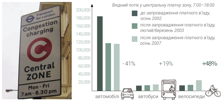 Лондонська влада у 2002 році запровадила платню за користування автошляхами. Водіїв моторизованого транспорту змусили платити за в’їзд до певної частини міста. Це швидко призвело до зменшення автомобільного потоку на 18%. Загалом рух став менш щільним, а отримані кошти йдуть на вдосконалення транспортної системи, яка нині збільшує пасажиропотоки. Також змінилася модель користування транспортом.