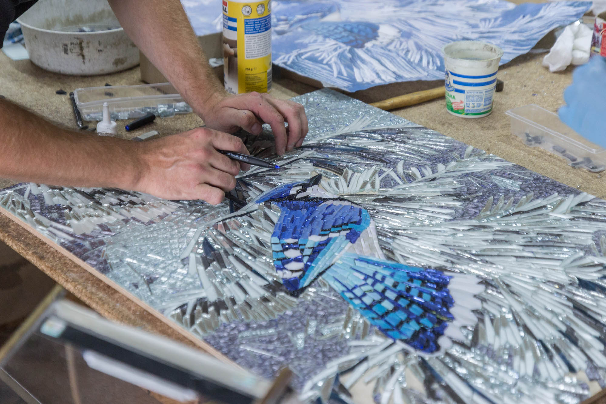 Окрім вітражів наша майстерня ще робить сучасну мозаїку з кольорового скла. Наприклад, зараз працюємо над великим проєктом для жіночого монастиря у місті Путивль. Вже багато років поспіль ми туди робимо мозаїку. Також виготовляємо кілька виробів для монастиря у Житомирській області. Нещодавно доробили мозаїку Анни Ярославни — королеви Франції. Цю роботу майстер робив близько трьох місяців: сам намалював ескіз та підбирав скло. Мозаїка буде виставлятися у Київському соборі й ми вже не дочекаємося дати її відкриття!