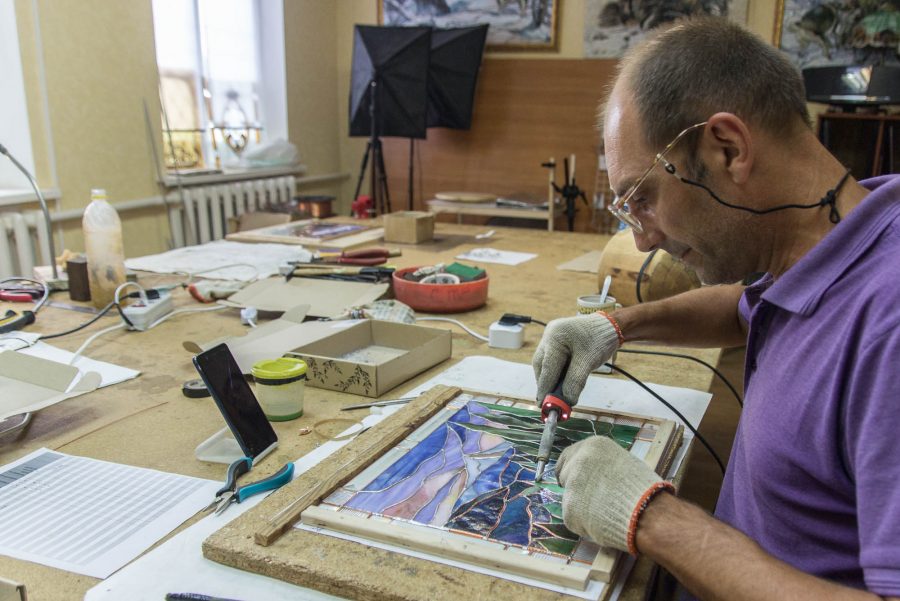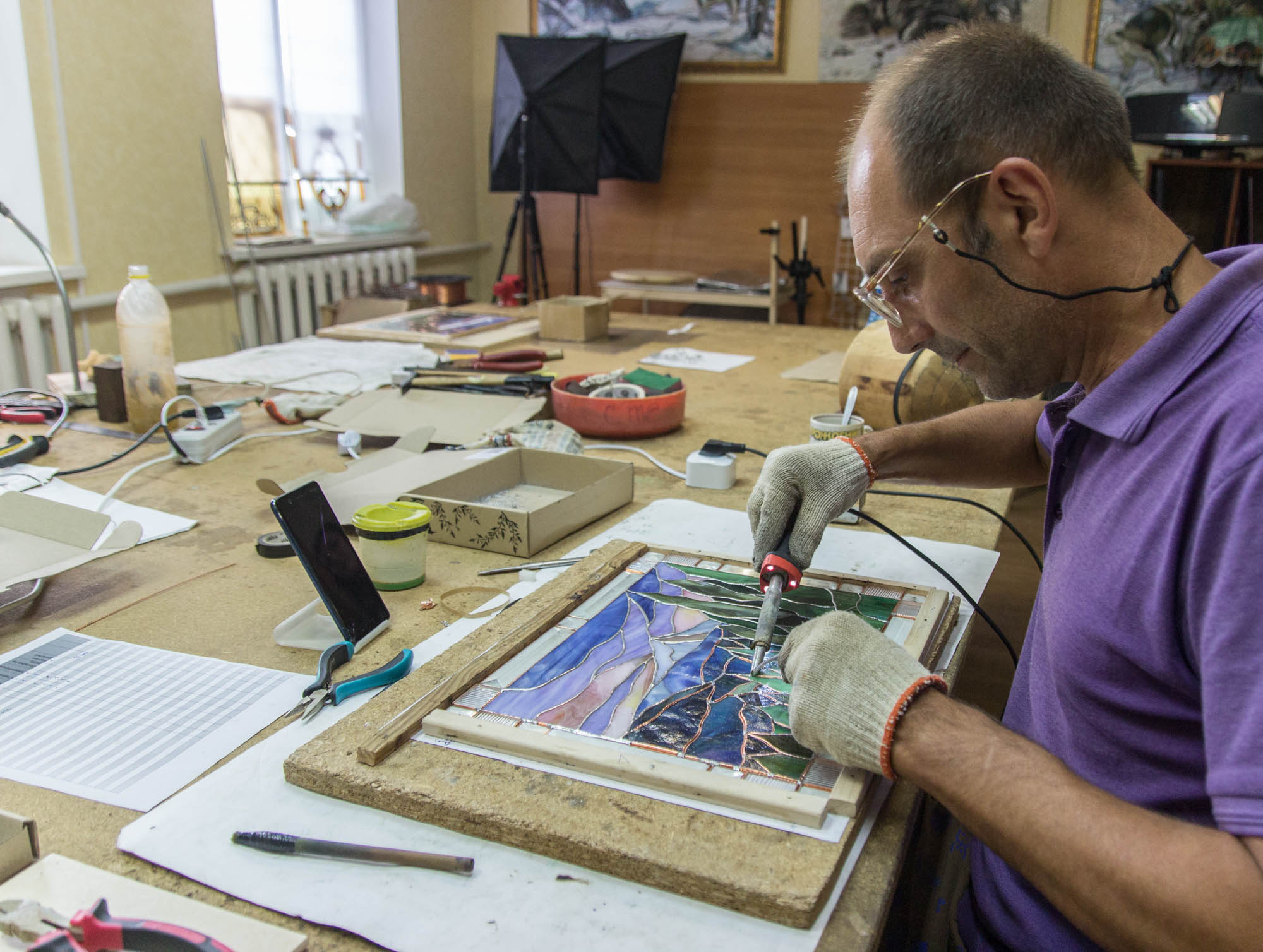 Раніше було так: роботу виконує один майстер, якому видається ескіз і він повністю виготовляє вітраж. Але це не дуже ефективно, адже увесь процес сповільнюється. Зараз же є шматок роботи й людина його виконує. Наприклад, дизайнер намалював виріб, зробив ескіз, а згодом віддає людині, яка нарізає скло. Ця людина передає далі. Поточили, підготували деталі, обернули та спаяли й знову передали. Тобто кожен виконує свою функцію і це сильно розганяє процес. Зараз ми лише починаємо таке вводити, але вже бачимо, як зростає виробництво.