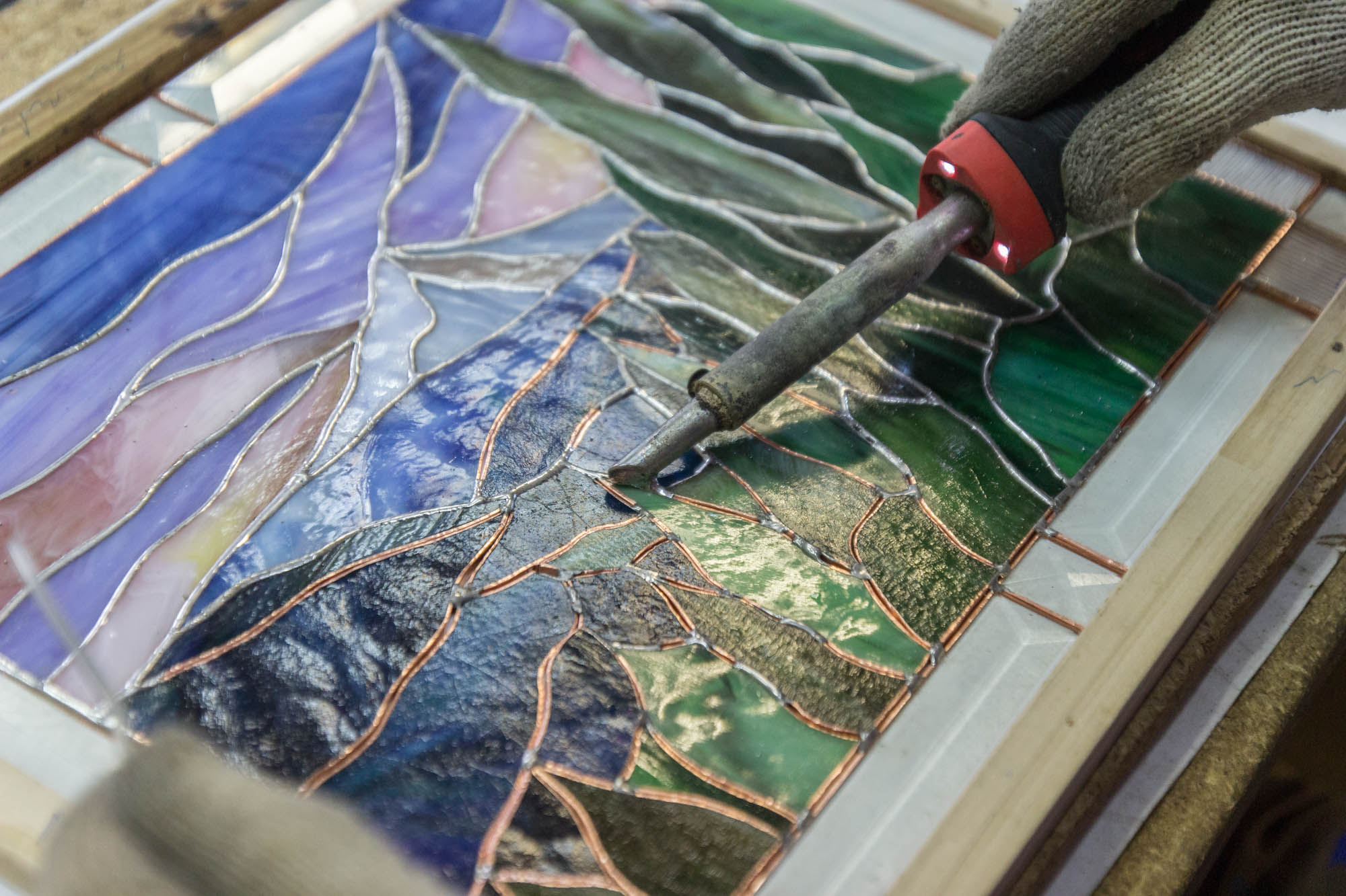 Далі кожну деталь слід підточити, аби були гладенькі, а не гострі кути. Потім береться кожна деталь, обертається мідною фольгою: вона затискається по периметру та притирається. Далі береться олово, паяльник і все це спаюється. Олово прилипає до фольги, і тим самим тримає її між собою, а фольга тримає скло. Потім олово тонується — його покривають спеціальним розчином і виходить вітраж. Увесь виріб згодом слід помити й почистити зубочистками, щоб кожен шовчик був чистим і нічого не залишилося.