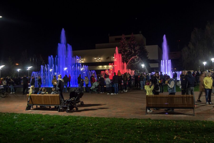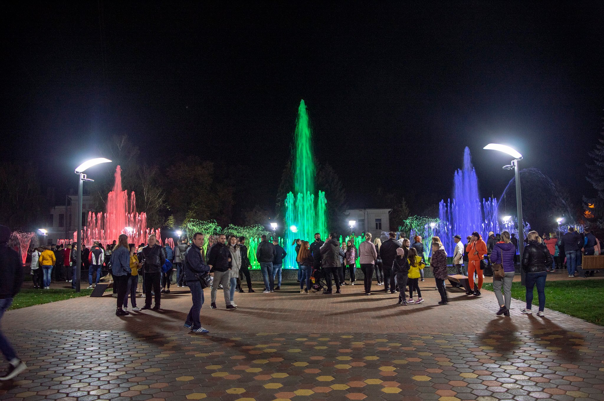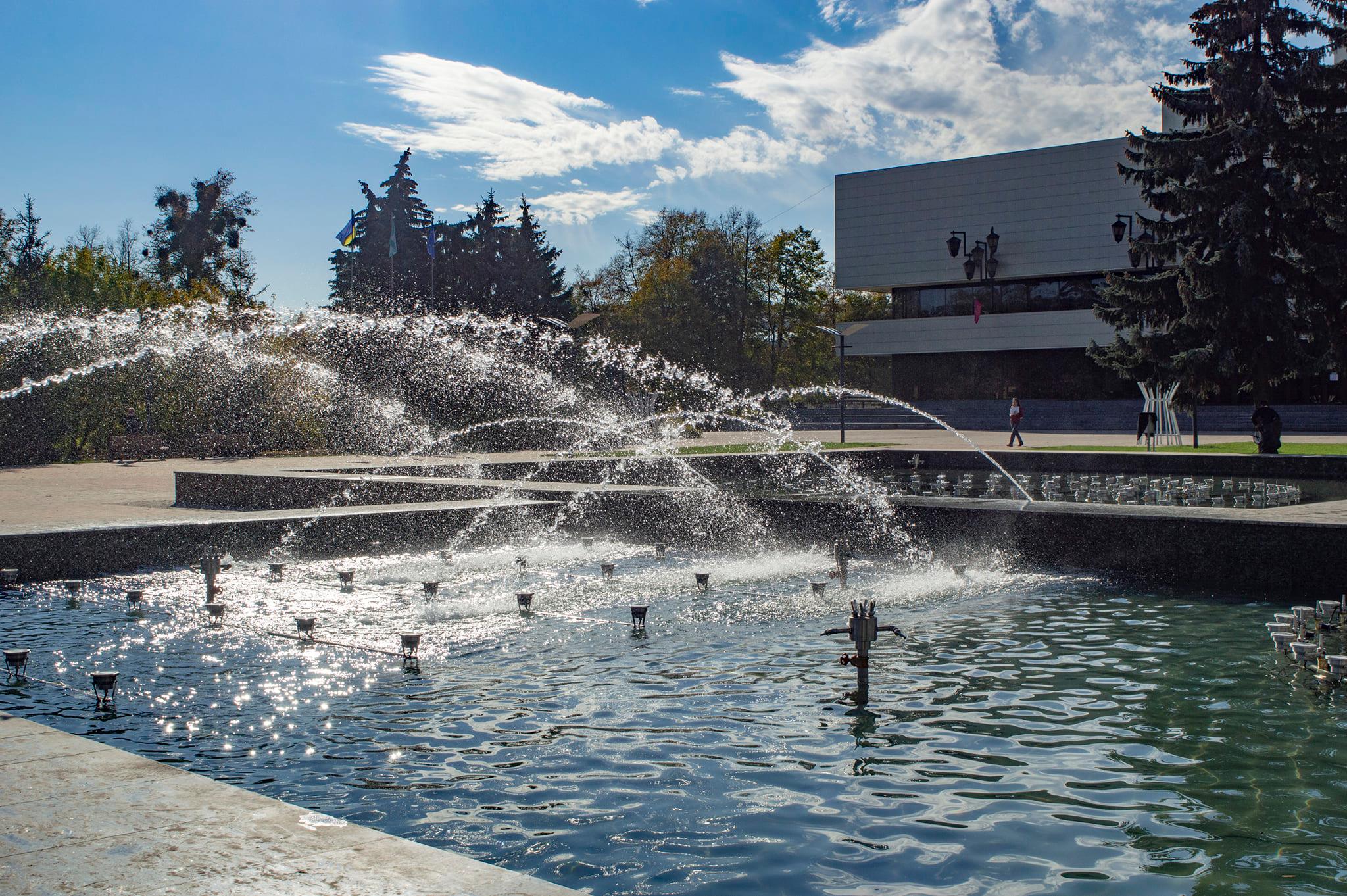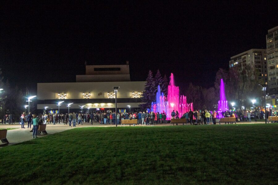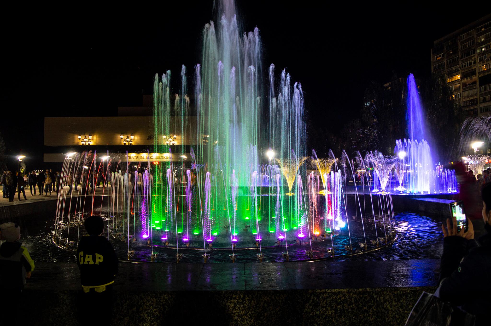 - Кольорова гамма освітлення фонтану. Вмикати червоний, зелений та синій кольори разом — не найкраща ідея. Краще використовувати водночас близькі відтінки кольорового спектра, а не контрастні, наприклад, тільки червоні чи тільки зелені. Особливо це відчувається на фоні стриманого вигляду театру імені Щепкіна.