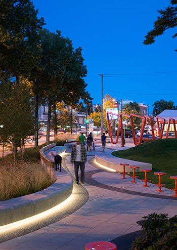 - Відсутність декоративного освітлення. Світло в архітектурі — особлива і дуже важлива складова. Для створення затишного ефекту вночі, використовують різнопланове декоративне освітлення: лавки, озеленення, пішохідні шляхи.