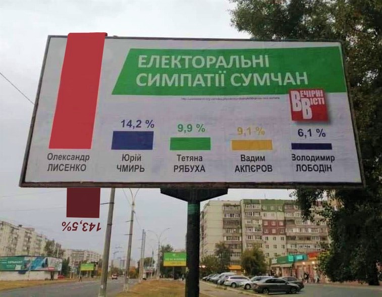 Окрім цього зовнішня реклама була розміщена з порушеннями законодавства – на ній відсутні вихідні дані, тираж та замовник реклами. Натомість є лише логотип газети «Вечірні вісті», яка не виходить з січня 2020 року. Газету пов'язують із партією «Батьківщина», зазначає Укрінформ.