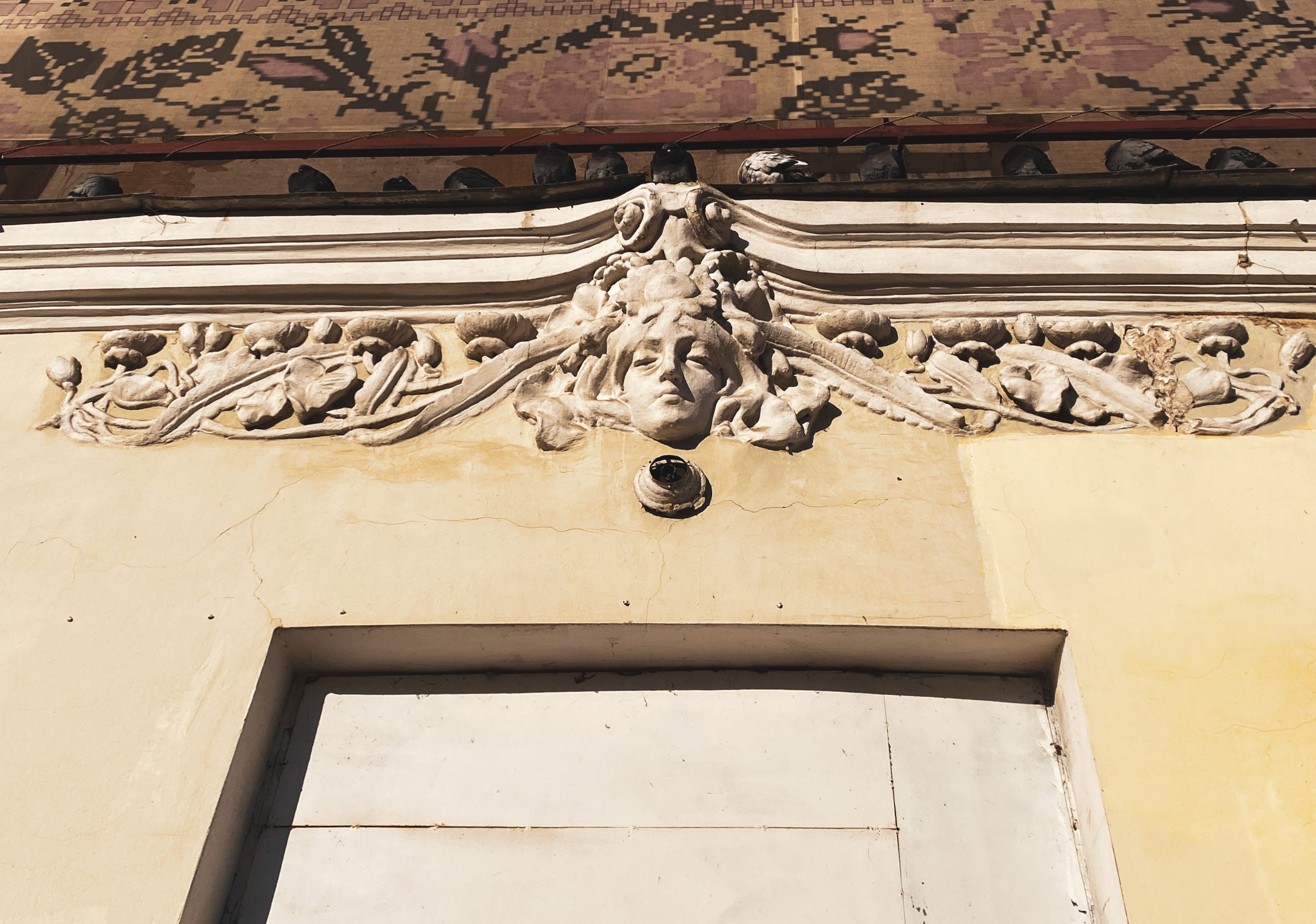Над дверима, поряд із відбійниками, зверху є ліпнина. Це маскарон — вид скульптурної прикраси у формі голови людини, тварини чи фантастичної істоти. Тобто це залишки модерну, якому понад сто років. Ми ходимо та бачимо, що цей будинок весь в руїнах, але ліпнина залишилась, і в радянський час її не добили. Маскарони над головним входом до будинку є в багатьох місцях, слід просто звернути увагу на таку архітектурну розкіш.