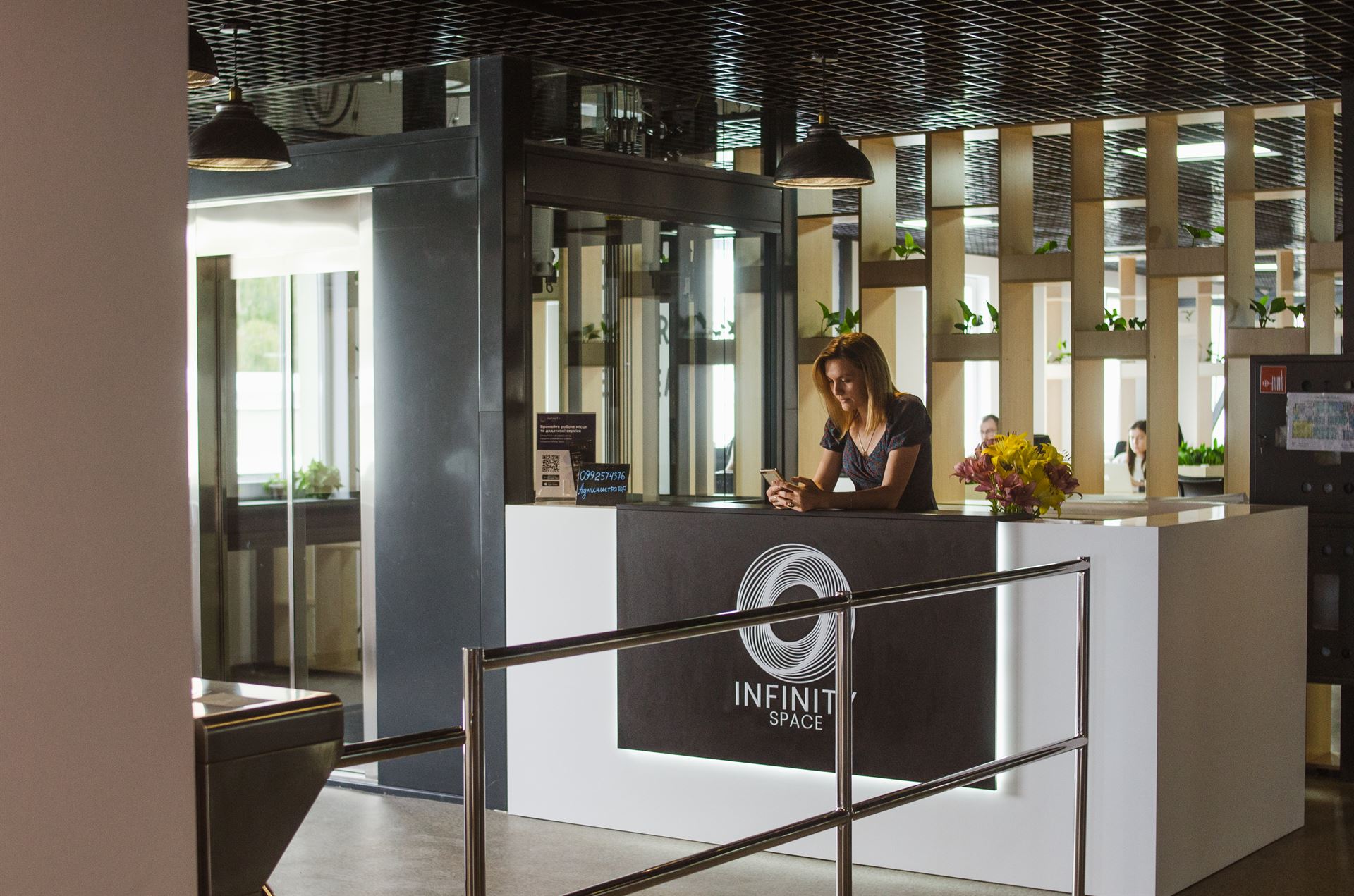 Тут можна зосередитися на роботі, не турбуючись про безпеку речей, бухгалтерію чи пошук проєктів. Для цього в Infinity Space є різні типи місць і переговорних кімнат, запрошені експерти і допомога з пошуком проєктів. А після роботи можете випите кави чи просто відпочити за столиками.