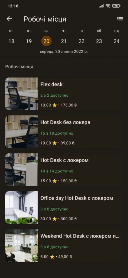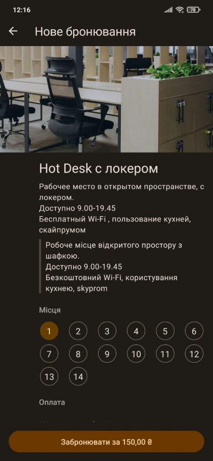Простір працює сім днів на тиждень. Тож сюди можна прийти як із діловими задачами в будні, так і у вихідні — писати книгу в тиші, наприклад. Щоб забронювати робоче місце, не доведеться телефонувати й тим паче приходити особисто. Усе необхідне є в застосунку для Android та iOS: обирайте серед п’яти видів робочих місць і трьох кімнат для переговорів. Тут одразу вказані ціни за день і місяць, можна забронювати переговорні кімнати на 15 хвилин і довше, а також замовити пробний візит, щоб більше дізнатися про простір.