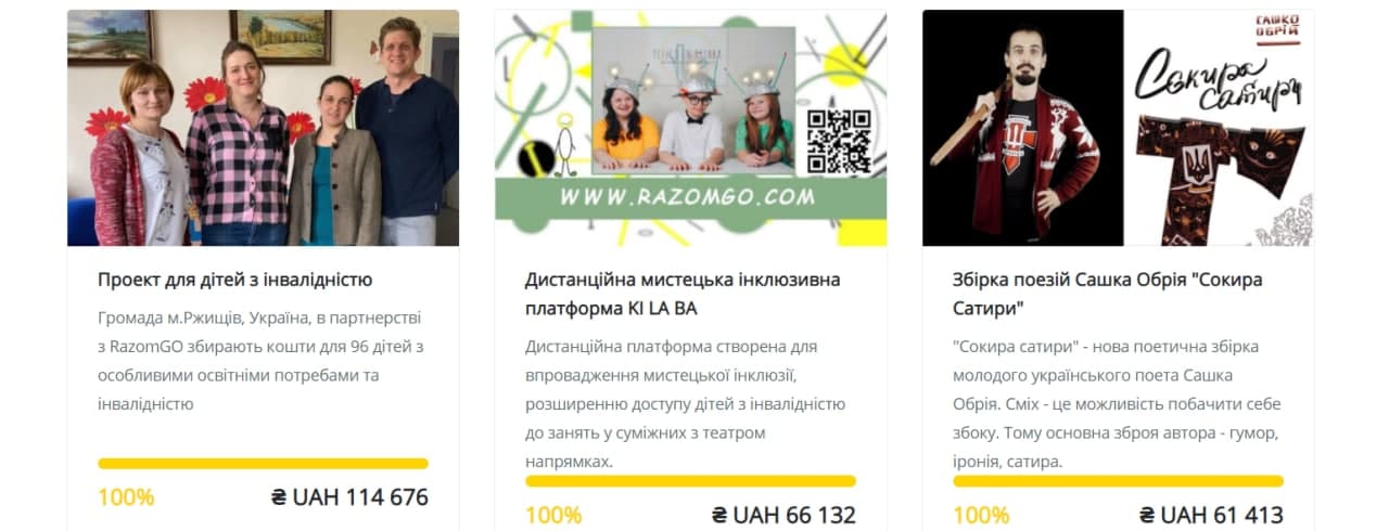 В Україні є дві найбільші краудфандингових платформи: «Спільнокошт» та «RazomGo». Раніше кошти на платформах виплачувалися його автору за умови збору 100% фінансування, проте зараз обидві платформи передбачають так звану «гнучку» схему — якщо ініціатор готовий реалізувати проєкт частково або залучити кошти в майбутньому, він може отримати кошти, зібравши щонайменше 50% від заявленої суми.