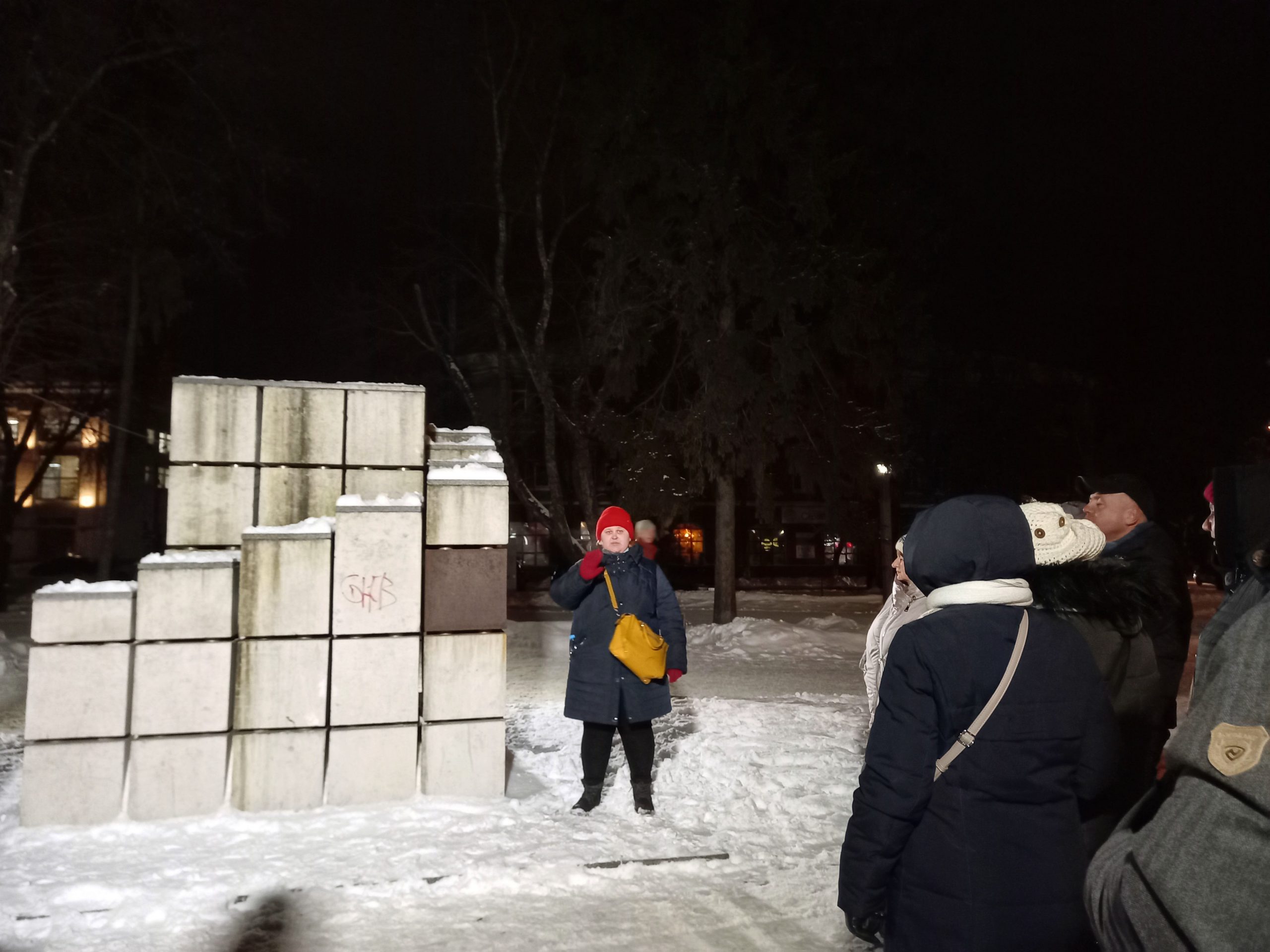 Вже за кілька миттєвостей туристи стоять навколо пам’ятника Студентській революції. Екскурсоводка розповідає про рух опору проти об’єднання трьох вишів в один, і про те, як перемога сумських студентів стала прикладом для активістів Помаранчевої революції.