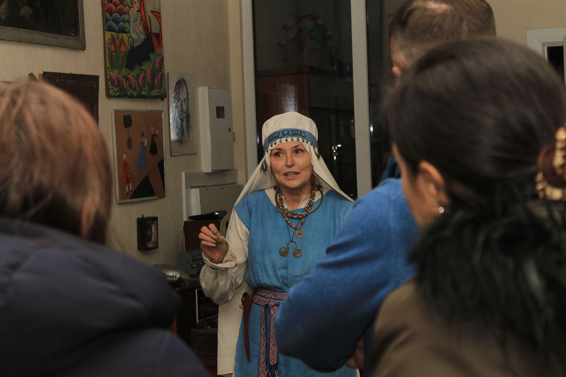 Екскурсії у своєму музеї Сергій проводить не сам. Часом разом із ним відвідувачів зустрічає і його дружина Наталія. Ось і сьогодні вона тут — у костюмі сіверянки, який шила власноруч.