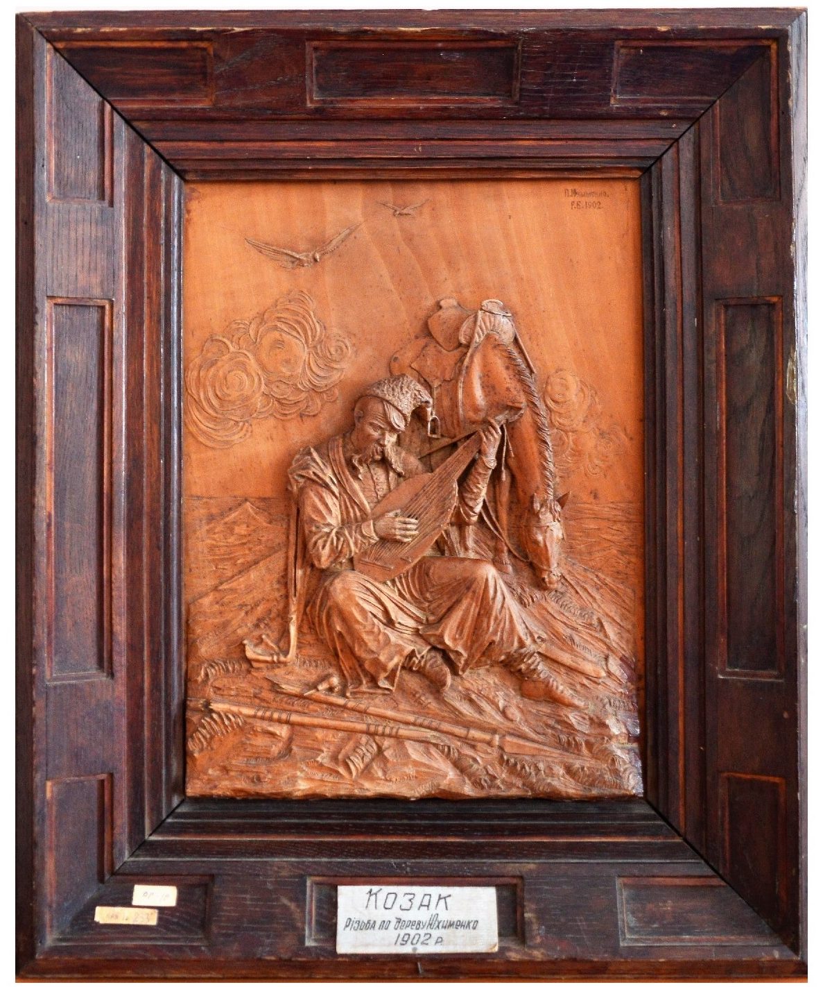 Унікальний зразок різьбленого виробу «Козак бандурист» також внесений до Державного реєстру національного культурного надбання та належить до колекції Охтирського краєзнавчого музею. Барельєф зроблений у 1902 році на горіховій деревині видатним українським різьбярем, народним майстром художньої обробки дерева, меблярем та скульптором з Полтавщини Прокопом Юхименком.