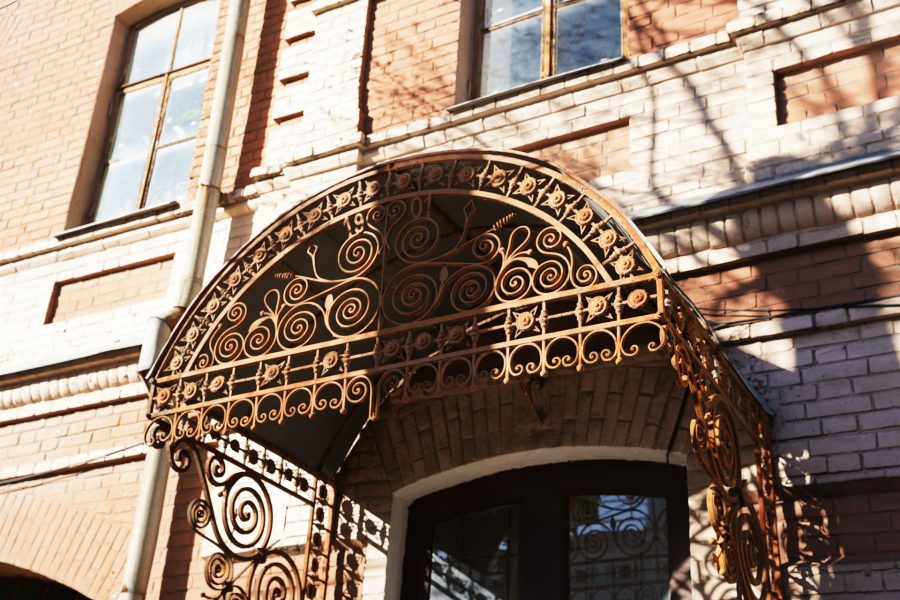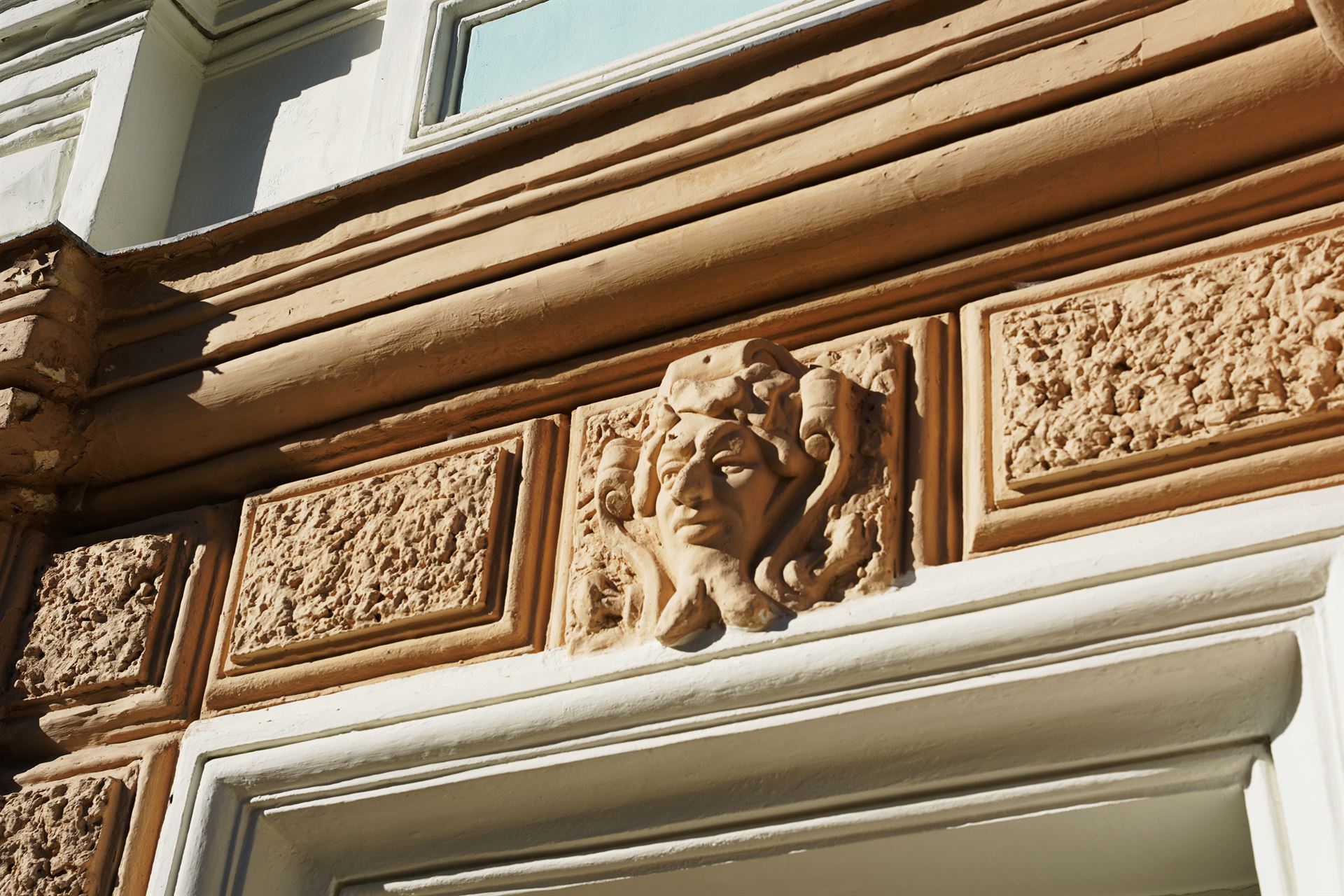 Садиба Суханових-Сумовських розташовується трохи далі від тротуару на вулиці Петропавлівській, але якщо підійдете ближче, то знайдете одразу кілька маскаронів — скульптурних прикрас, які зображують міфічних істот, тварин і людей. Коли будівля була білою, вони створювали рельєф і додавали їй об’ємності. Сенс цих елементів уже не дізнатися, але милуватися ними можна й зараз.