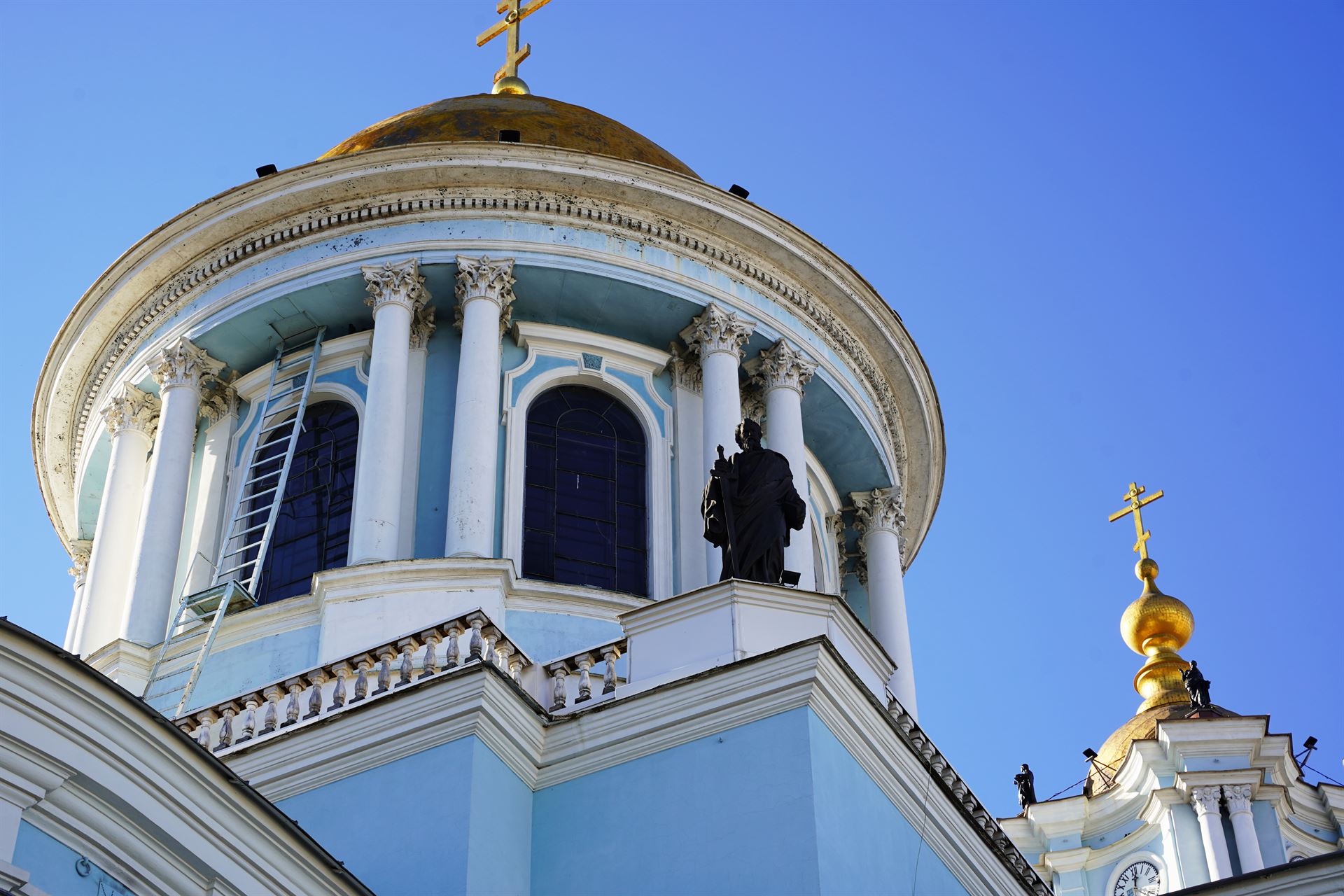 Якщо обійти Спасо-Преображенський собор на вулиці Соборній, позаду можна побачити скульптуру Святого Павла. Така деталь вирізняє сумський храм, оскільки тривимірні фігури не притаманні православ’ю, а більше використовуються у католицизмі. Меч Павла направлений донизу й означає «готовий обороняти».