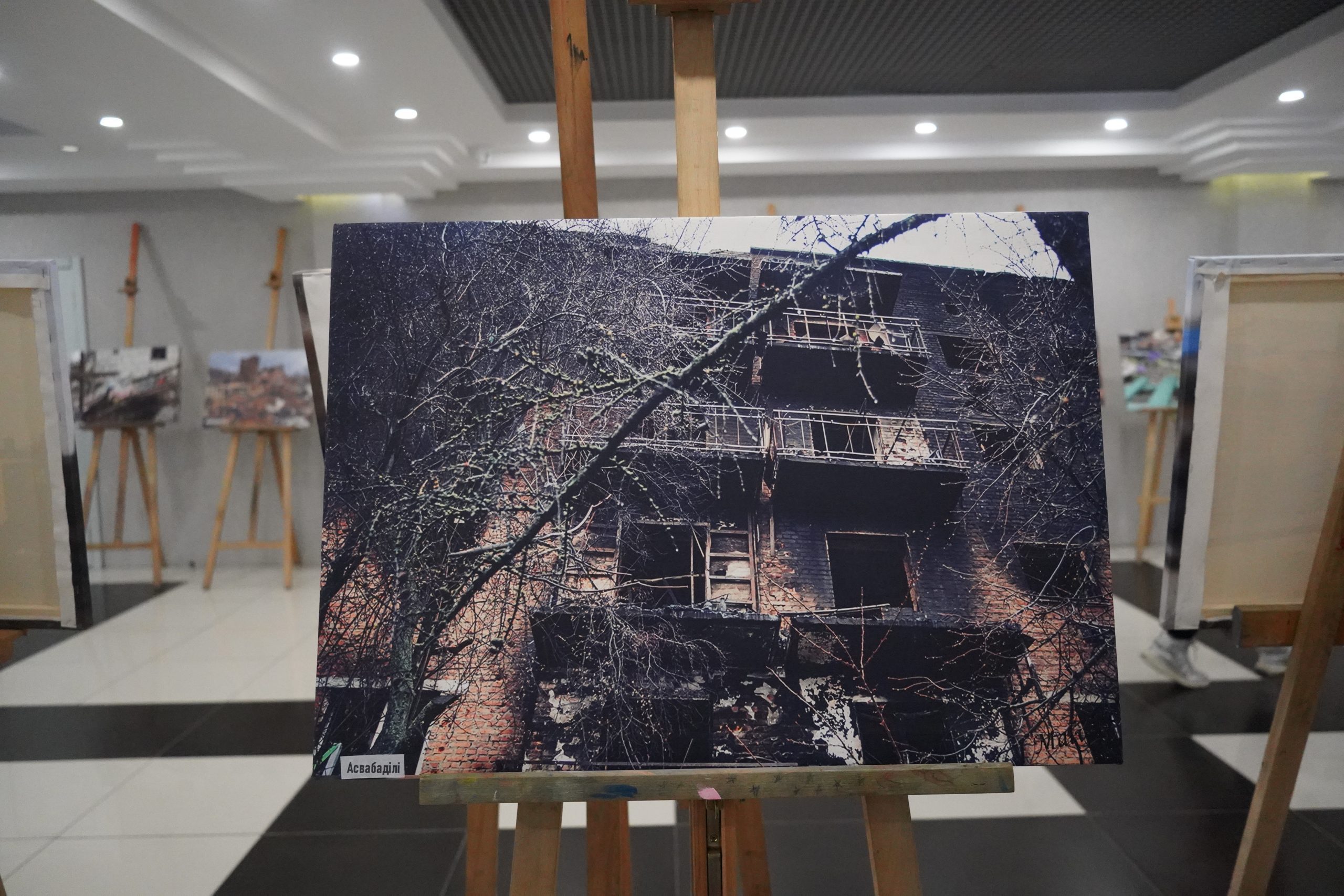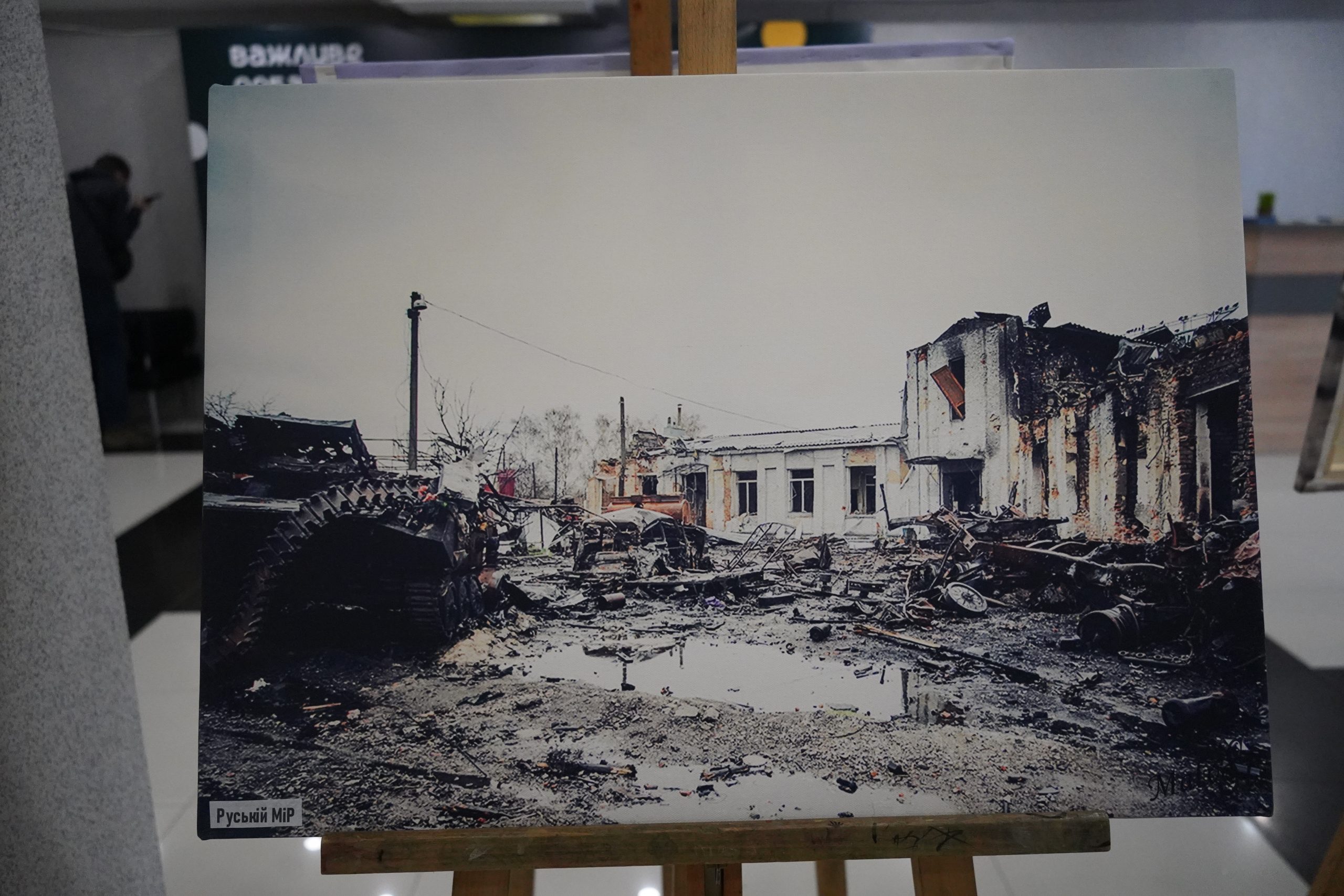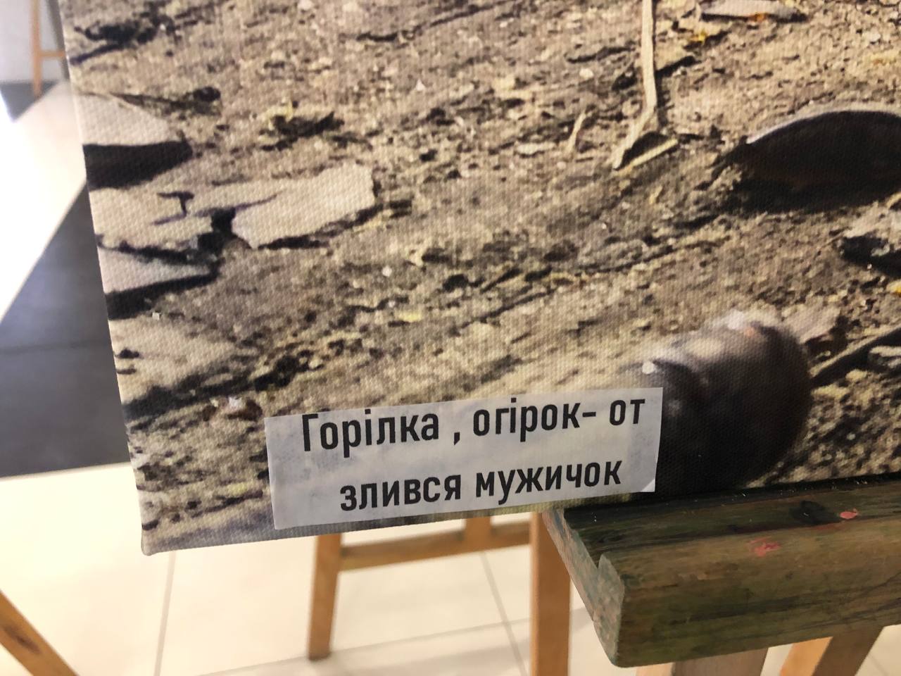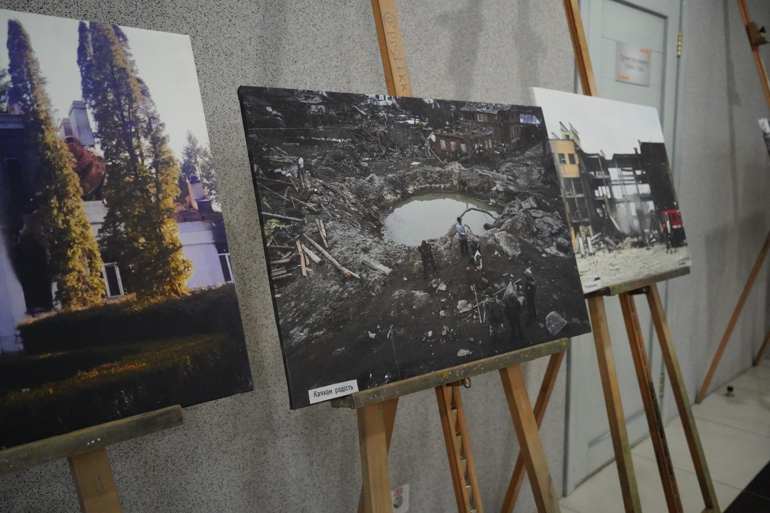 «Ми не планували робити жодних написів. А потім, перед відкриттям, нам сказали, що так не можна і треба терміново придумати підписи. Ми знали, що там будуть діти, тому не хотіли писати про трупи та вибухи, тож вирішили в такий спосіб згладити для них цю інформацію», — зазначають фотографки.