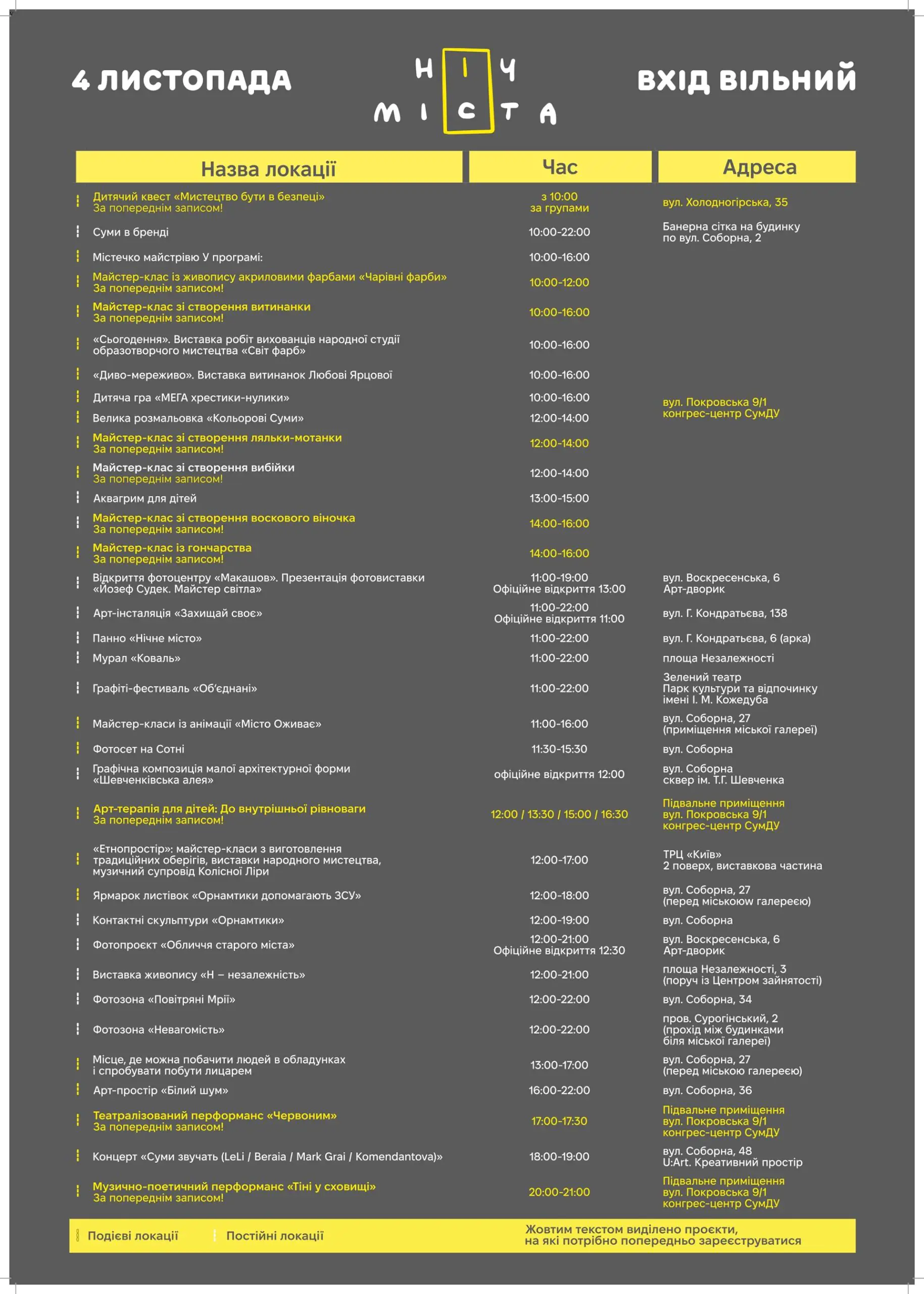 Вже вшосте фестиваль збере на вулицях сум’ян та митців. «Ніч міста» створено для того, щоб надати можливість представникам місцевого креативного середовища реалізувати свої проєкти, а сум’янам — побачити різноманіття культури та отримати натхнення для позитивних змін в сучасних умовах.