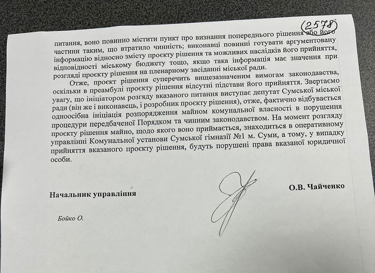 3-го серпня колектив гімназії відправив листа до сумського міського голови Олександра Лисенка, в якому наголосив на тому, що чотири кабінети, які фігурували в проєкті рішення СМР, використовують належним чином — в освітньому процесі. А отже вилучати такі приміщення забороняють закони України «Про освіту» та «Про повну загальну середню освіту». Також про неможливість передачі приміщень ідеться у юридичному висновку правового управління Сумської міської ради від 3 серпня, фото цього висновку колектив гімназії надав редакції Цукру.