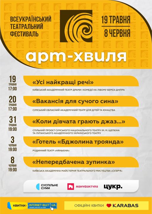 У травні повернеться театральний фестиваль «Арт-хвиля», який замінить «Чехов-фест». Цього місяця в межах події відбудуться 3 вистави в різних театрах Сум:
