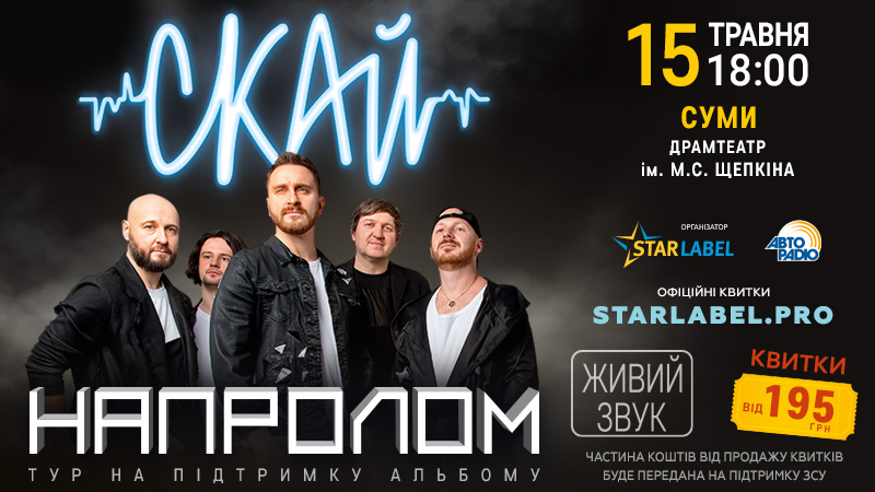 Рок-гурт Скай випустив сьомий студійний альбом «Напролом» та відправляється у тур на його підтримку. Гурт виконає як нові пісні з альбому, так і вже відомі хіти: «Тебе це може вбити», «Струна», «Подаруй світло», «Best друг» та інші. Квитки коштують від 295 до 1095 гривень. Частину коштів обіцяють передати на потреби ЗСУ.