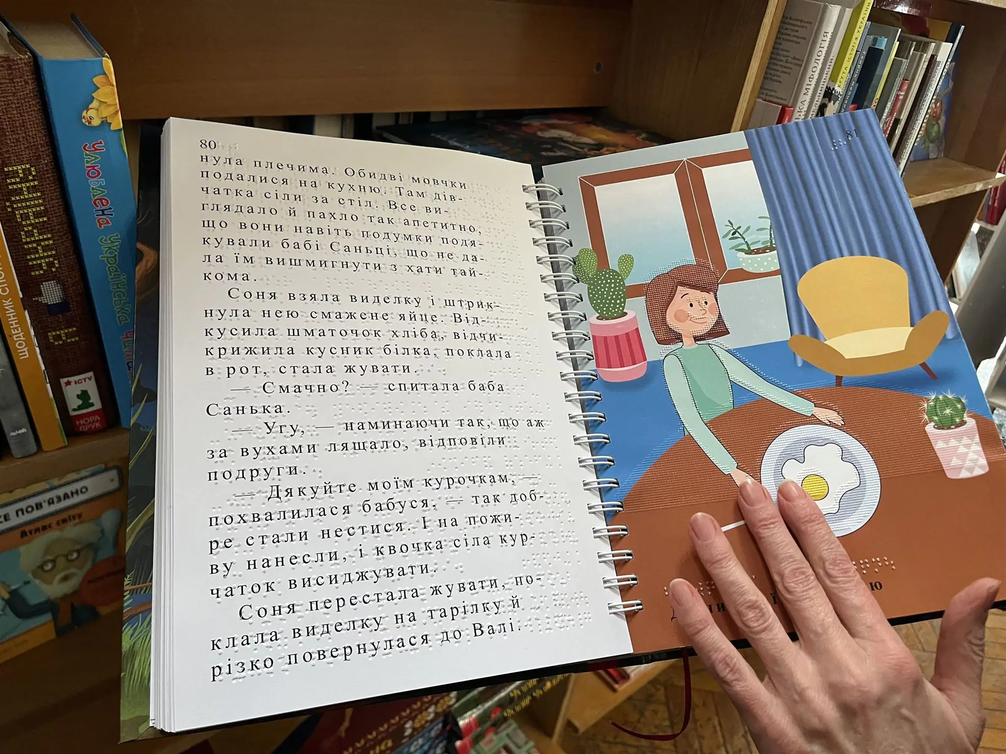 У Сумській обласній універсальній науковій бібліотеці є кілька книг шрифтом Брайля для людей із порушенням зору. Зокрема, це «Аліса в країні див» Льюїса Керрола та «Чудове чудовисько і погане поганисько» Сашка Дерманського. Додому видають лише літературу з відділу абонемента, говорить завідувачка цього відділу Людмила Яценко. Зокрема, на полицях в абонементі є: