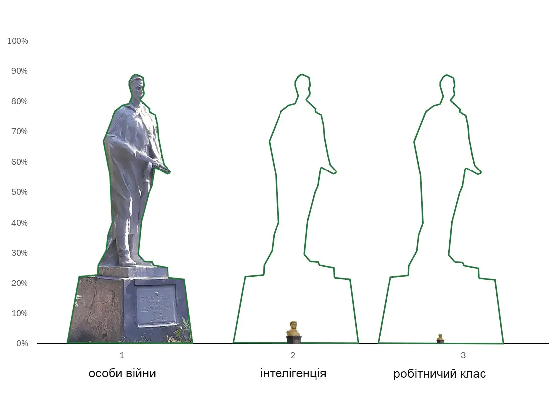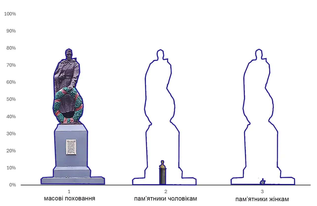 Інакше кажучи, на кожні 14 пам’ятників чоловікам припадає лише один пам’ятник жінці.  Ця статистика має неприємний вигляд, навіть за умов розгляду лише індивідуальних пам’ятників. Диспропорція представлених статей була б більш разючою, якби включала масові могили — вони теж здебільшого увіковічують військових чоловіків. Наприклад, у Київській та Полтавській областях на 1 пам’ятник жінці припадає 67 і 68 пам’ятників чоловікам.