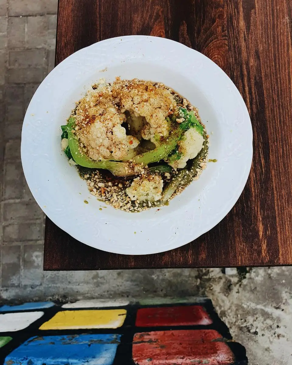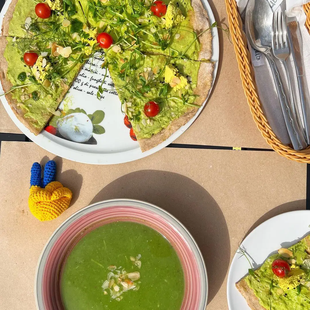 Кафе Foodie пропонує салат з авокадо, овочеву піцу з тофу, зелений удон, стейк з цвітної капусти, кешью-кейк, хумус з фалафелем і вінегрет.