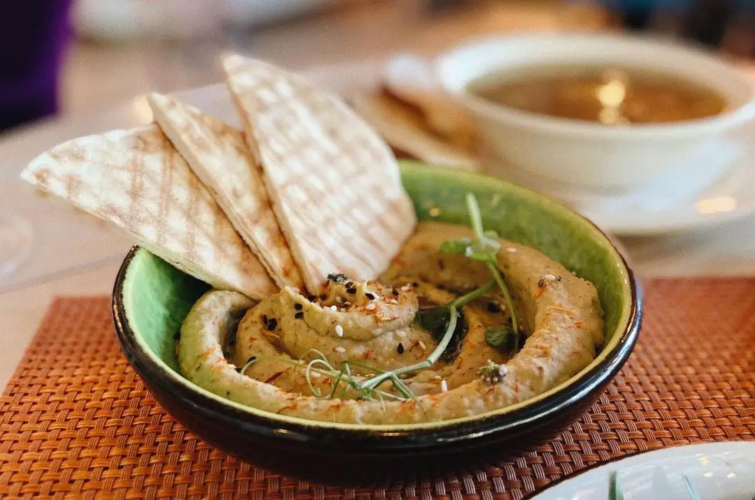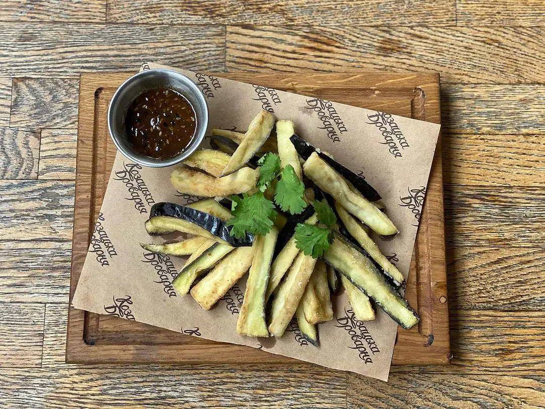 У пабі SolodKava можна замовити хумус із запеченим перцем, баклажани фрі, рисові чипси, горіховий мікс й овочевий салат.