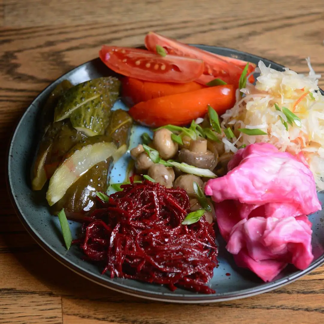 Ресторан «Шалена шкварка» пропонує мариновані печериці, соління, овочі гриль, свіжу капустку з огірком і кропом та селянський салат.