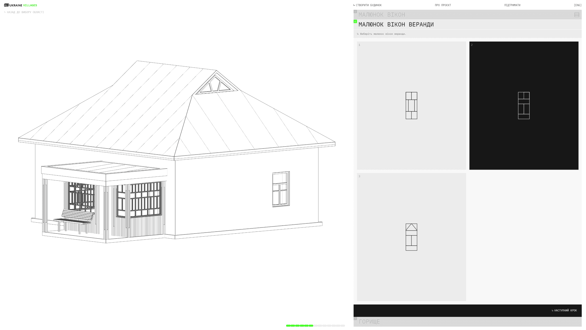 Онлайн-конструктор доступний за цим посиланням. Спочатку в ньому потрібно обрати площу будинку та планування кімнат. Далі — тип покрівлі й веранди: розмір, наявність навісу та матеріал, із якого виготовили. Також ви обираєте форму вікон веранди, горища, а для самого будинку ще і їхнє обрамлення з цегли чи дерева.