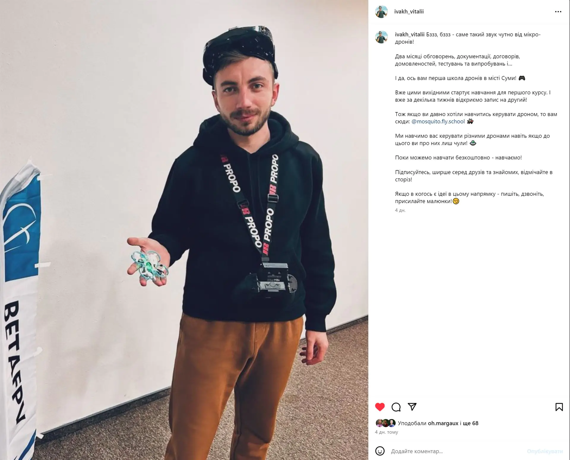 Про відкриття Mosquito fly school написав у своєму Instagram Віталій Івах, організатор забігів Race project у Сумах. Говорить, що перший курс уже почав опановувати безпілотники, а про запис на другий оголосять за кілька тижнів. Зв’язатися з школою можна через їхній акаунт в Instagram. Цукр розповідає деталі.