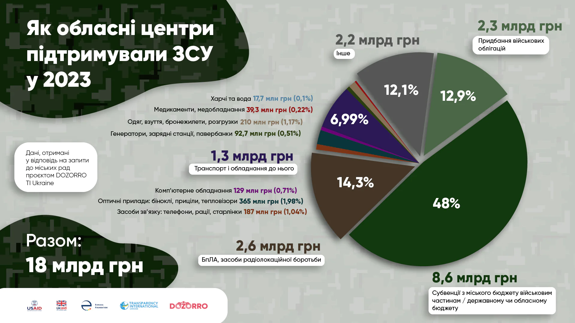 Згідно з дослідженням, у 2023 році всі міста передали на підтримку Сил оборони 18 мільярдів гривень. Найбільше вони використовували субвенції, тобто перекази коштів в інші бюджети чи військові частини, а також на БпЛА та засоби радіолокаційної боротьби. Окрім цього, міста купували військові облігації.