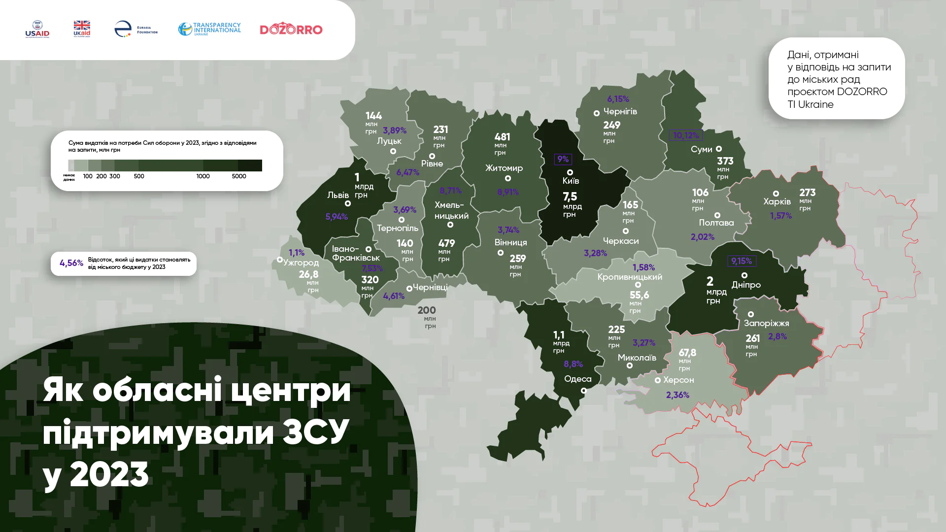 У відсотковому співвідношенні у 2023 році найбільше на фінансування сектору оборони витратили міські ради Сум — 10,1% видатків місцевого бюджету, Дніпра — 9,2%, Києва — 9%, Житомира — 8,9%, Одеси — 8,8%, Хмельницького — 8,7%, Івано-Франківська — 7,5%. Також міста передавали військовим ті речі, які в них вже були на балансі.