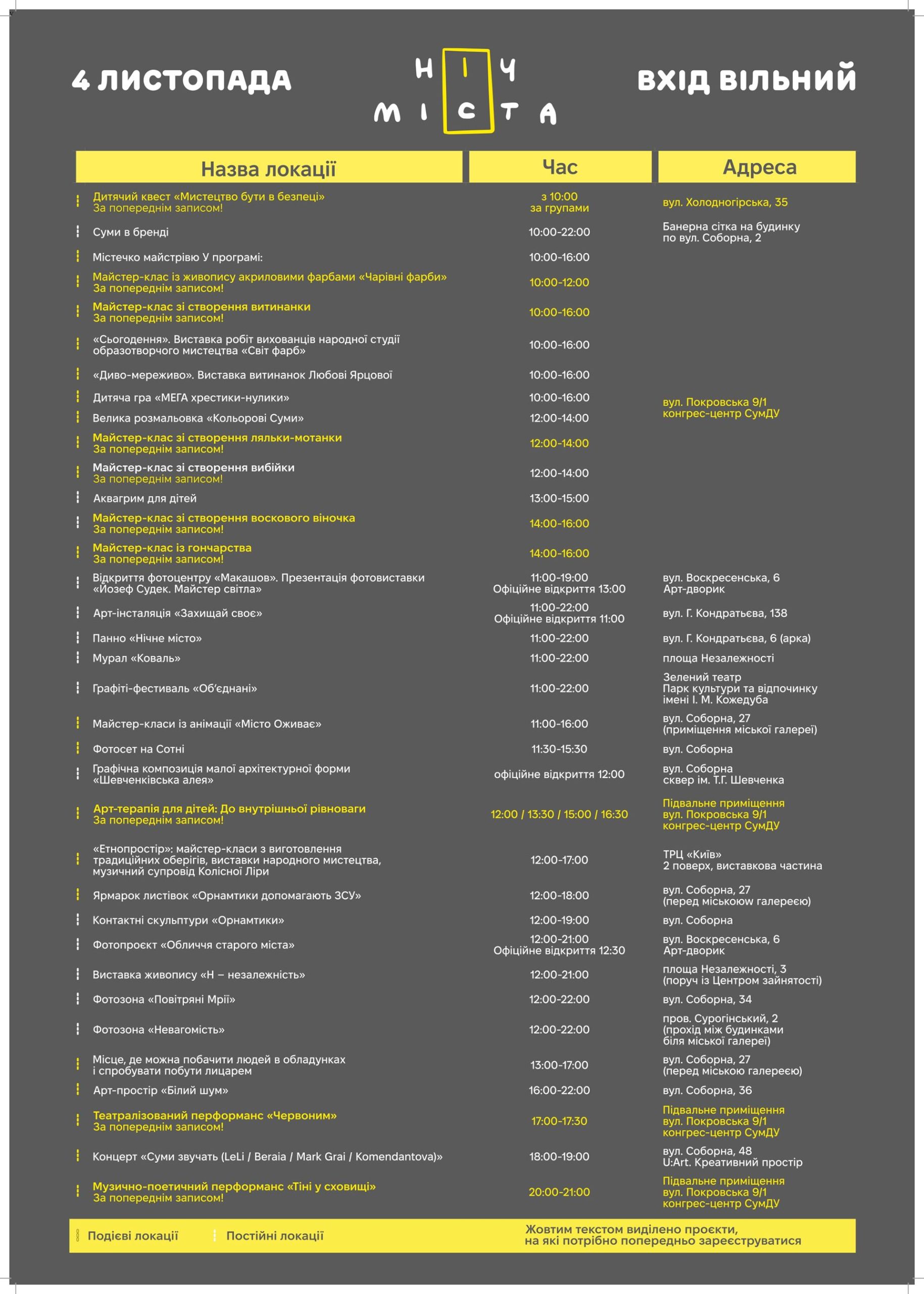 Вже вшосте фестиваль збере на вулицях сум'ян та митців. «Ніч міста» створено для того, щоб надати можливість представникам місцевого креативного середовища реалізувати свої проєкти, а сум'янам - побачити різноманіття культури та отримати натхнення для позитивних змін в сучасних умовах.