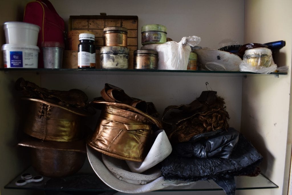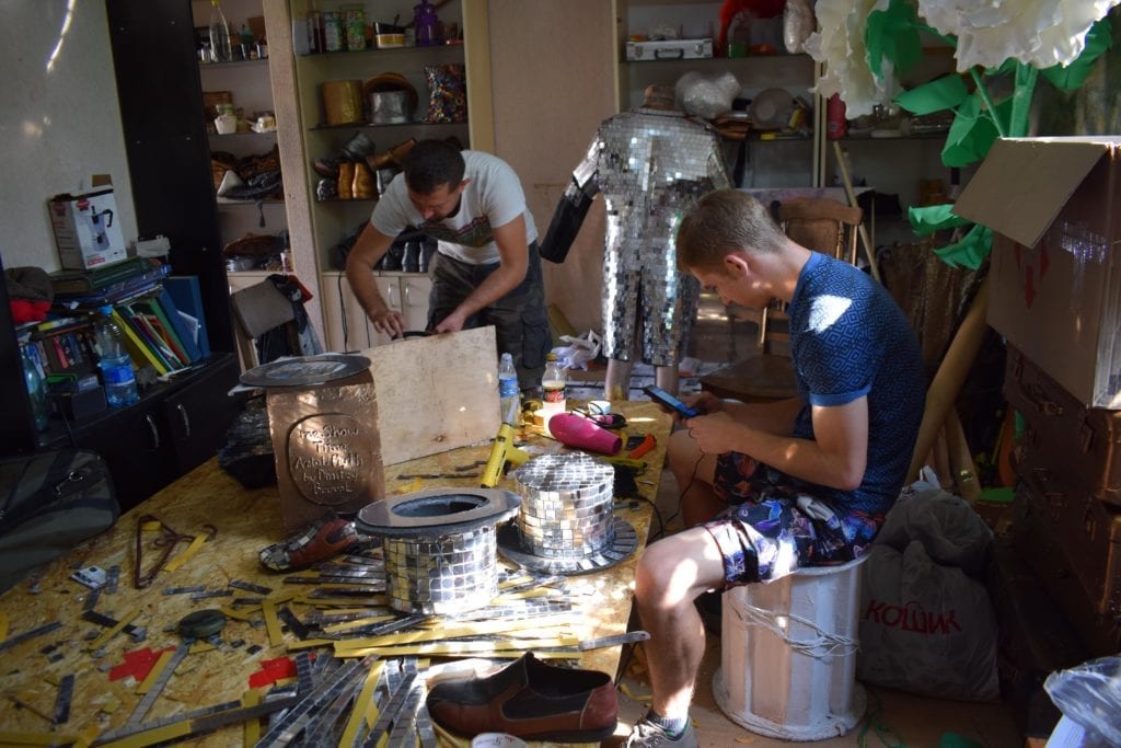 У роботі він з 7-ї ранку. Тут, серед манекенів, костюмів і реквізиту, команда готуєтсья до фестивалю, який об’єднає атристів живої скульптури, пантоміми та вогняного шоу з шести міст України.