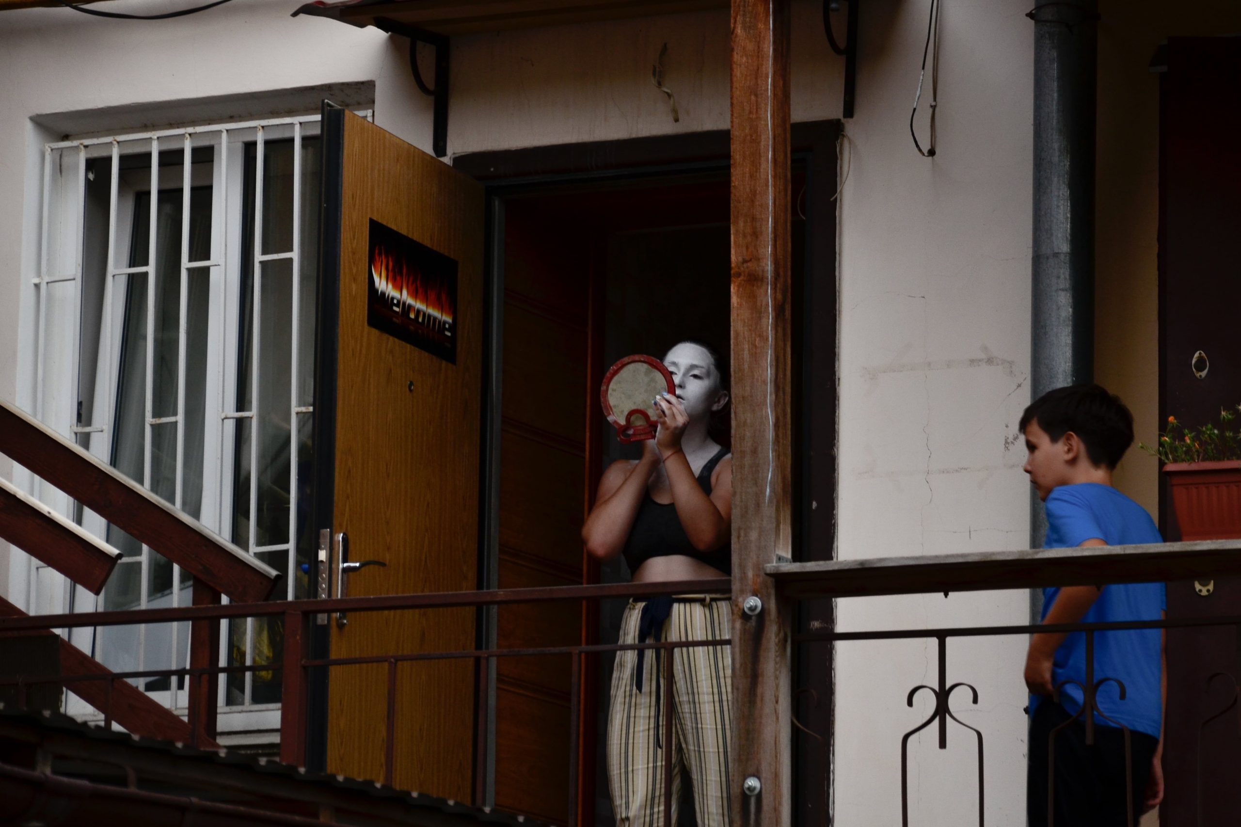 Через чотири дні команда аматорського театру «Ми є» відіграє цю виставу в рамках фестивалю «Ніч міста» у дворику майстерні «Артіль МІФ». А зараз, після двох прогонів, до Дмитра збирається невелика черга: Дима, я не сильно много бегаю? А я не сильно кричу? Там где точки і коми, остановиться трохи, да?
