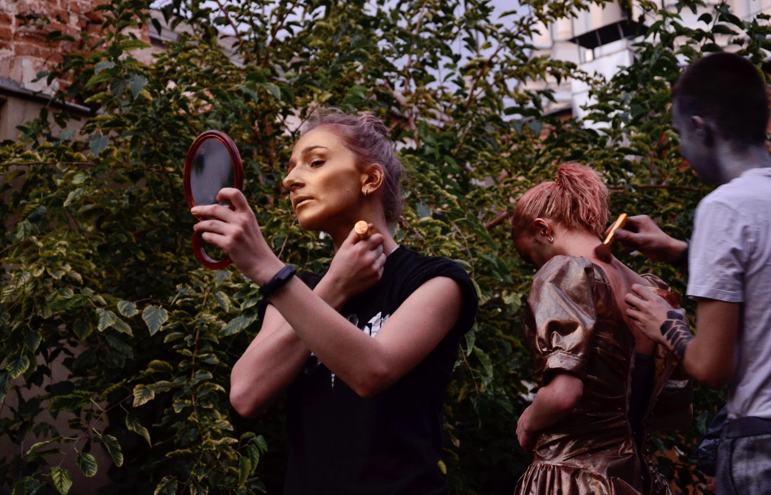 Тим часом цю функцію бере на себе майстерня «Артілі МІФ», де починають перевтілюватися запрошені артисти. Попри невтішний прогноз, небо над Сумами несподівано ясне, і весь двір стає гримеркою живих скульптур. Вправні рухи роблять їхні обличчя золотими, срібними, бронзовими, чавунно–чорними чи білосніжно–гіпсовими. Пушкін відточує аристократичні рухи, Козак підкурює останню сигарету, Авантюристка тренує відповідний до образу погляд, Балерина — статичну рівновагу.
