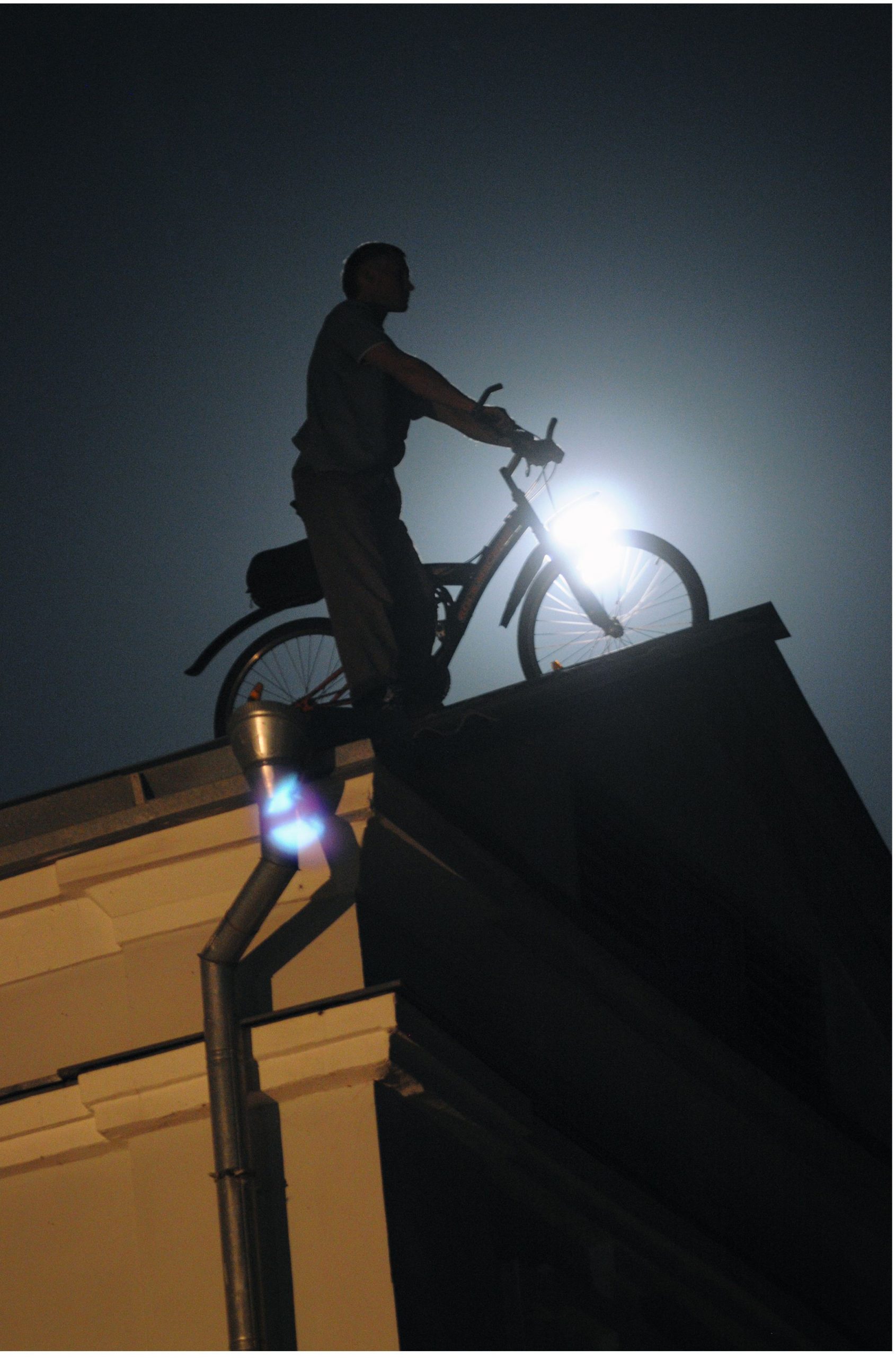 Вилисипидист Густав на даху банку у місячному сяйві. Фото Олега Дем’яненка