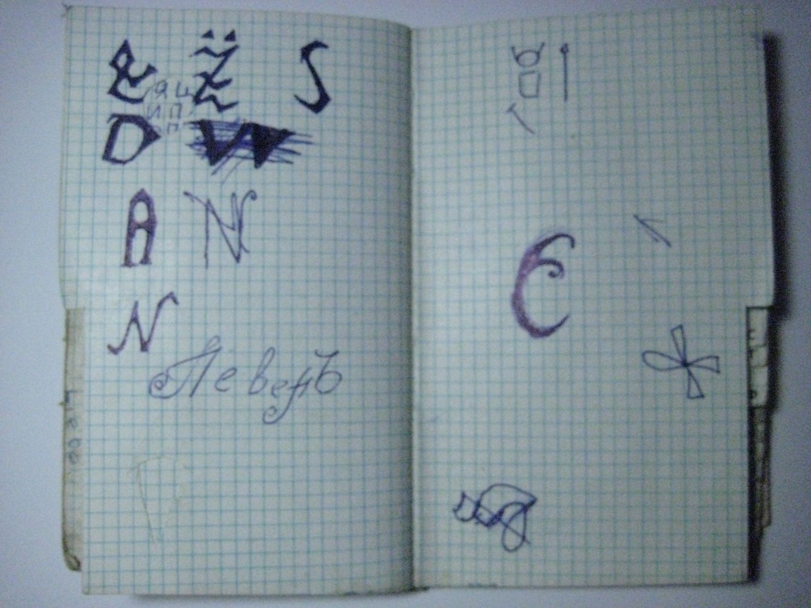 Ага. Ну от, я брав книжки і перемальовував з них літери. Я не можу пояснити, чому я це робив, просто мені подобалось. Була якась естетична потреба.