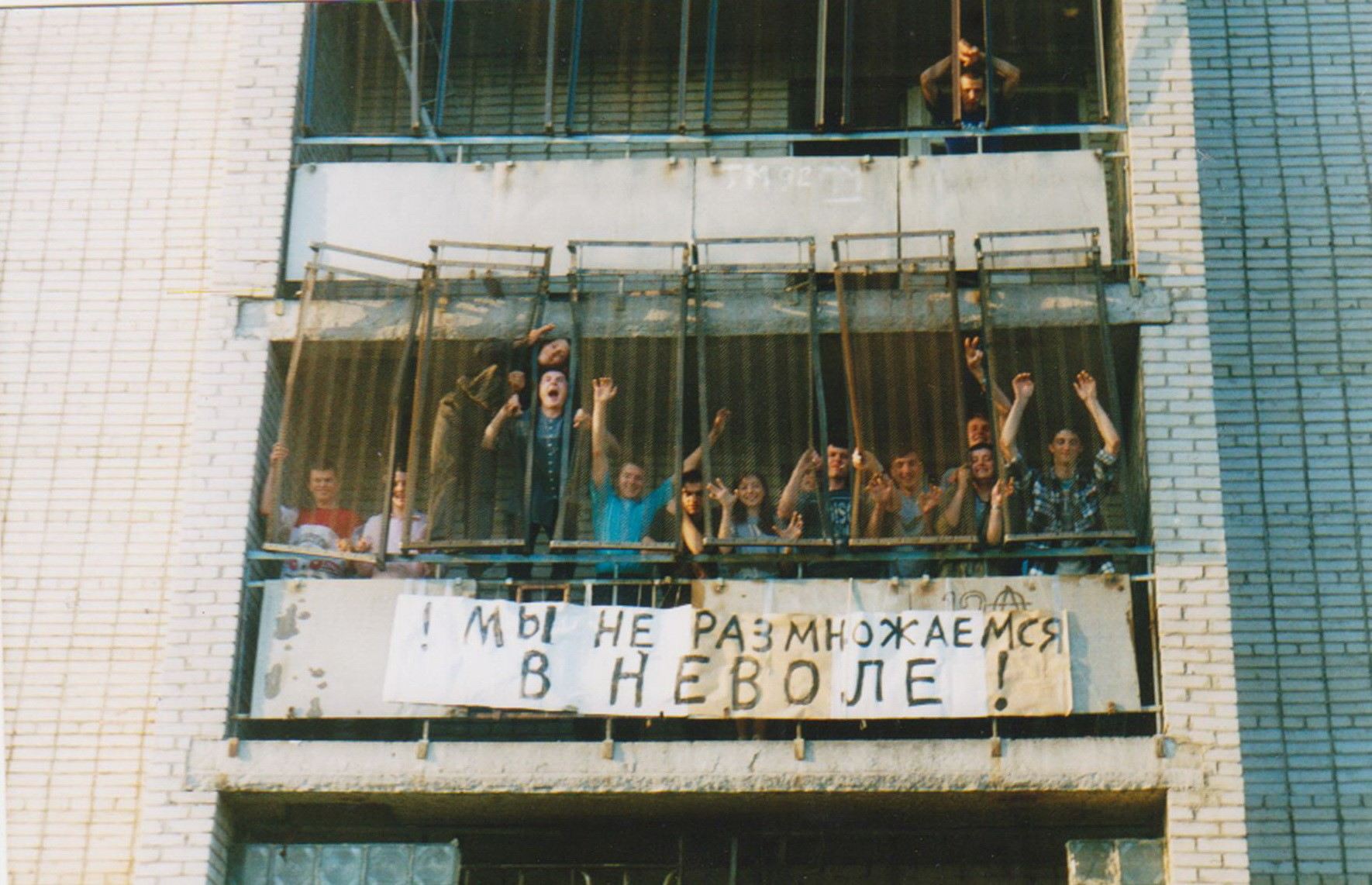 Якось для запобігання несанкціонованому проникненню у гуртожиток балкони заварили малоестетичними сітками з панцерних ліжок. Ми обурились такому обмеженню свободи і вивісили банер для привернення уваги - тут знадобилися мої навички шрифтарства.